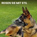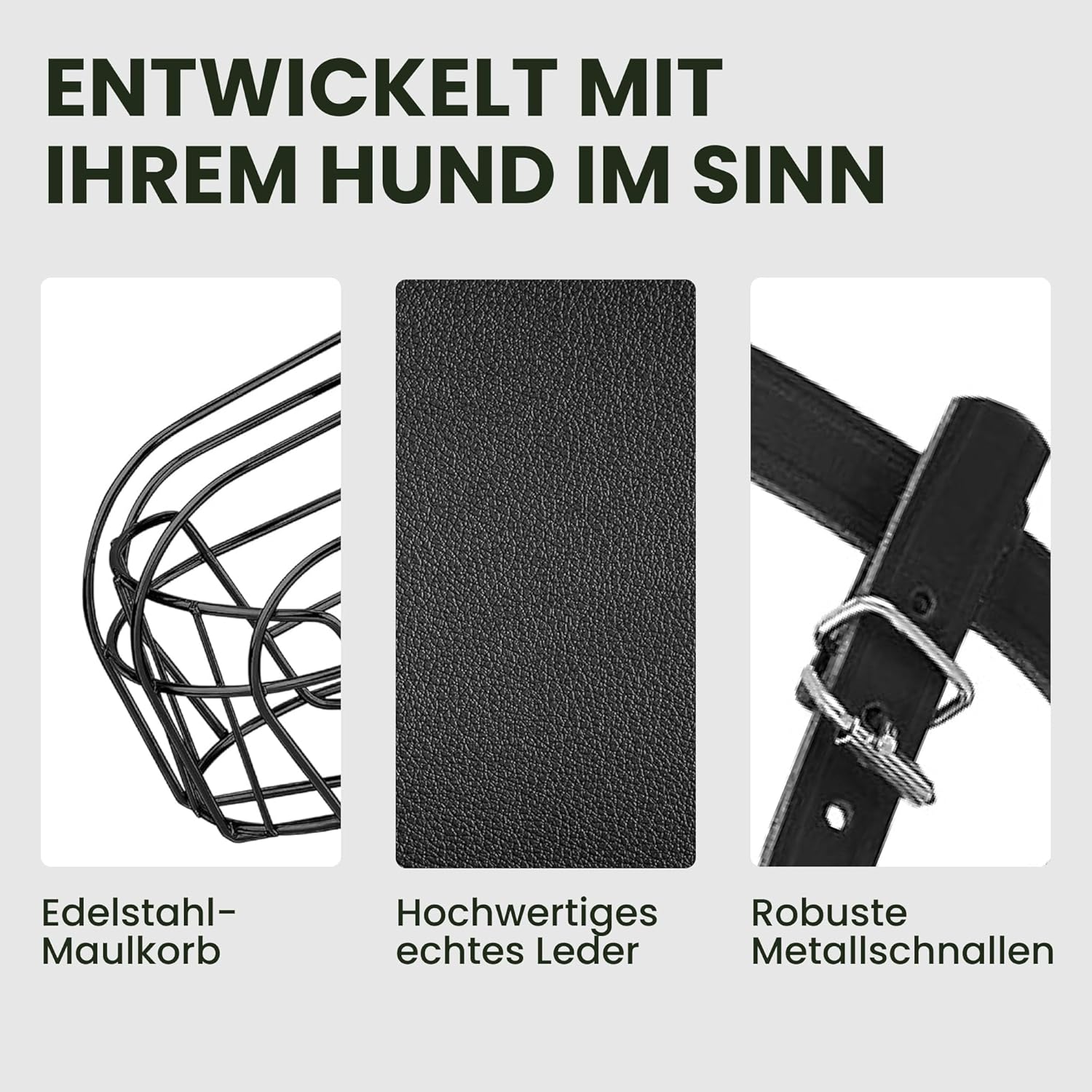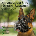 - Metal basket dog muzzle with adjustable leather straps is designed to fit securely over the dog's snout, to prevent the dog from biting or eating things they shouldn't while still allowing them to breathe and drink easily. Safe shape basket dog muzzle allows unrestricted nose licking. Dog muzzle for large dogs has excellent ventilation, no breathing discomfort in the heat. Unlike nylon printed muzzles this construction is more secure and longliving.