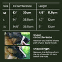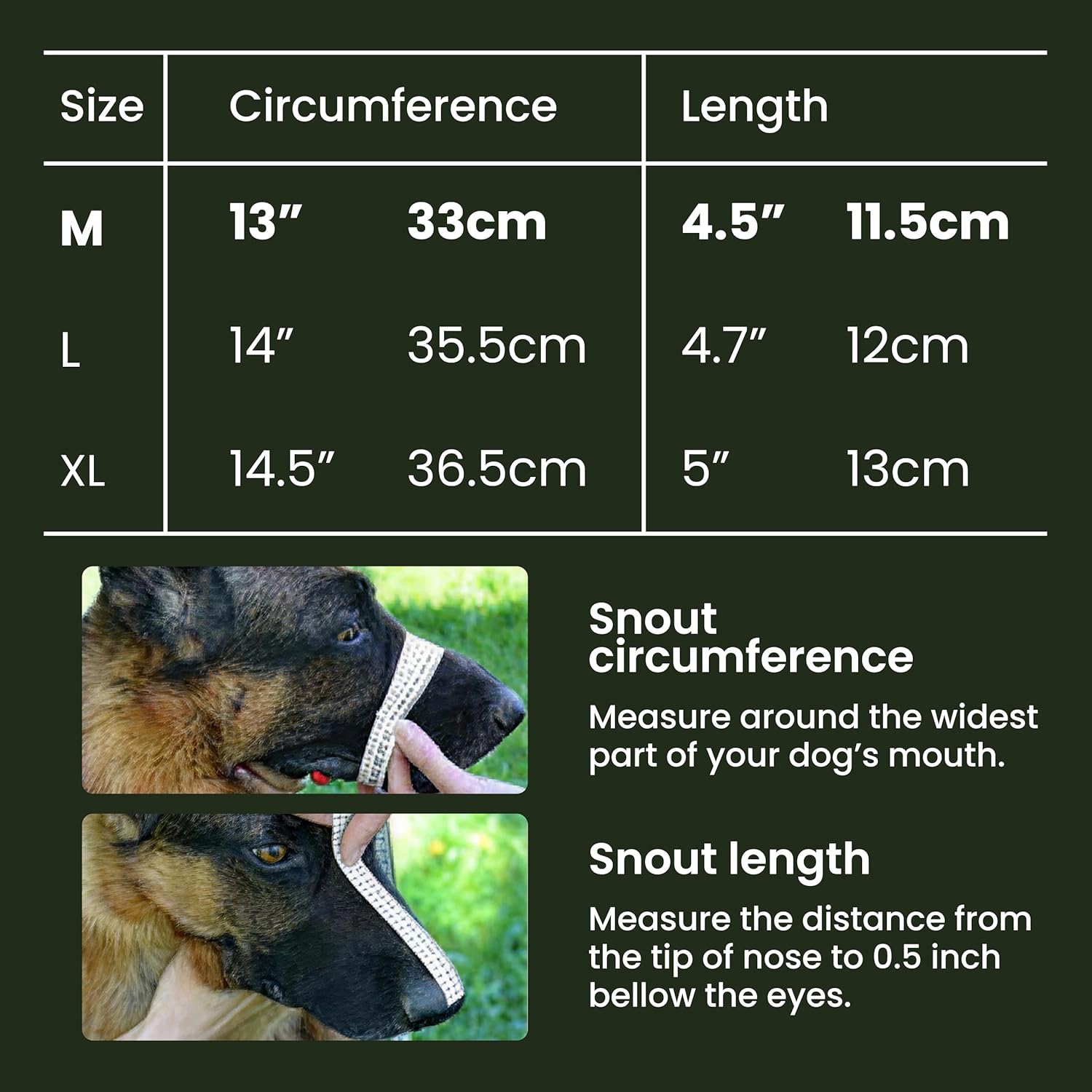 - Size M. Fits best for Snout Girth: 13 inches, Snout Length: 4 inches. Selecting the right size and fit ensures the muzzle is comfortable and effective.
