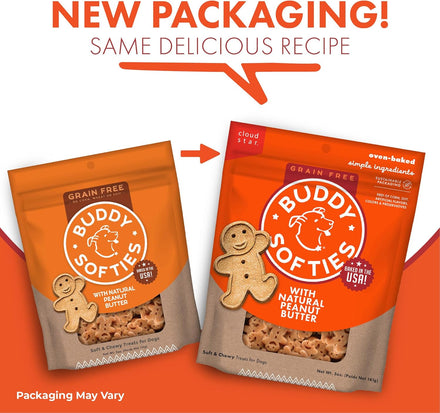 • BUDDY BITE-SIZED SOFTIES: Contains ONE 5 oz. bag of grain free Buddy Softies that are enjoyed by all dog sizes - but favored by small to medium breeds. Baked to perfection, our bite-sized soft & chewy treats are satisfying for dogs in any life stage