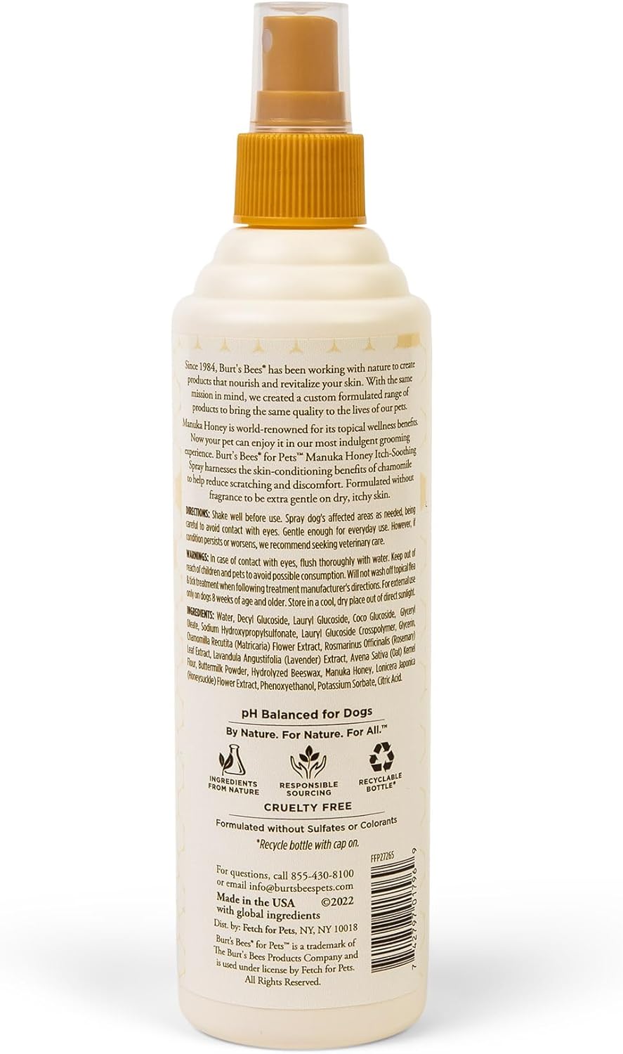 Burt’s Bees for Pets Manuka Honey Itch Soothing Spray for dogs harnesses the soothing benefits of chamomile to help calm skin irritation Our Manuka Honey line is specially formulated to leverage the superior skin wellness benefits of Manuka Honey, a dark, rich honey from a single floral source in New Zealand & Australia, combined with additional naturally derived ingredients to target specific pet grooming needs. Whether you’re looking to nourish your pup’s skin or you simply love the shiny coat that comes from our high quality, nature-based ingredients, Burt’s Bees with Manuka Honey offers our most nutrient dense, soothing, and indulgent pet grooming formulations yet. This mild spray is pH balanced especially for all dogs and puppies over 12 weeks of age and will not interfere with topical flea and tick treatments. Since 1984, Burt’s Bees has been working with nature to create products that nourish your skin. With the same mission in mind, we created a custom formulated range of dog shampoos to bring the same quality to the lives of our pets. Leveraging the power of naturally derived ingredients, lavender and green tea soothe and soften the coat while honey acts as a conditioner and regulates the delicate pH unique to pets, delivering a high shine finish. All our dog grooming products utilize 95%+ natural origin formulas and are formulated without chemical detergents, phthalates, parabens, or sulfates. Our dog sprays are also formulated without added colorants and dyes. Burt’s Bees naturally derived pet grooming solutions keep pets clean and pet parents happy! Our dog spray is cruelty-free and made in the USA with global ingredients, using 80% post-consumer recycled bottles and responsible sourcing.