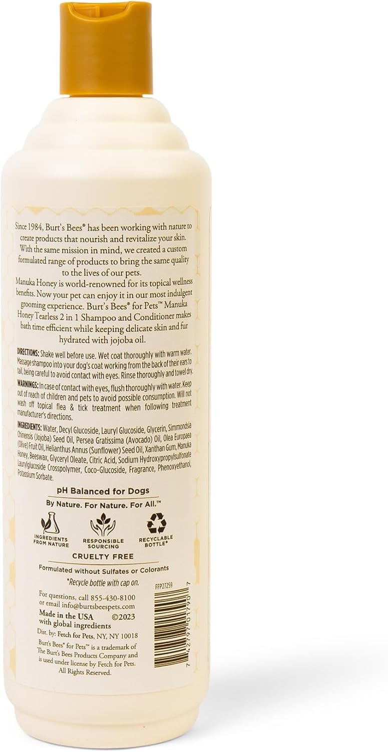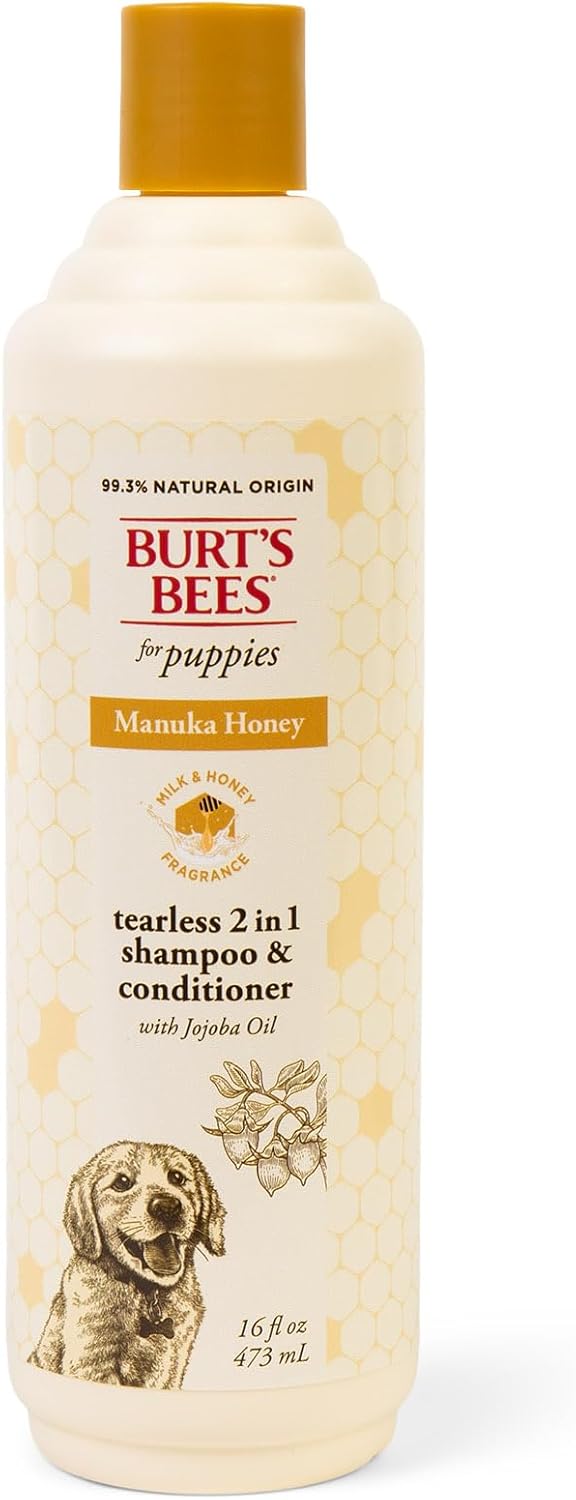 - 16 FL OZ TEARLESS 2-IN-1 PUPPY SHAMPOO + CONDITIONER – This puppy shampoo and conditioner leverages the power of naturally derived ingredients like jojoba oil and manuka honey to gently but thoroughly cleanse puppies.