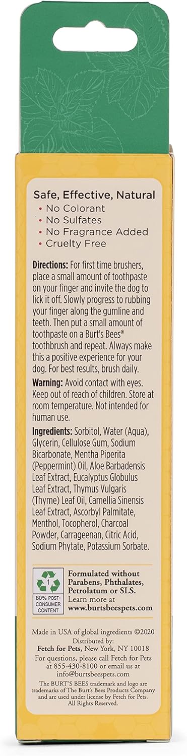 Since 1984, Burt's Bees has been working with nature to create products that nurture your health. We believe that pets are family, so we're bringing the same natural attention and care to your closest furry friends. From Burt’s Bees grooming products to dog dental care and cat dental products, Burt’s Bees is here to keep your pet healthy. Natural, effective, and pH balanced for dogs, the Burt's Bees for Dogs Fresh Breath Dog Toothpaste with Peppermint Oil gives dogs a fresh and cleansing way to keep their mouths as clean as can be. This dog toothpaste is made from natural ingredients to be safe and effective. This toothpaste for dogs has no colorants, no sulfates, no added fragrances, and is cruelty free. When used with the Burt's Bees for Dogs dog toothbrush with natural bristles, the dog toothpaste and dog toothbrush make the ideal dog oral care kit for your dog's oral care routine. Use Burt's Bees for dogs products that are made in the USA to give your dog healthy and clean teeth. Directions: For first time brushers, place a small amount of toothpaste on your finger and invite the dog to lick it off. Slowly progress to rubbing your finger along the gumline and teeth. Then put a small amount of toothpaste on the Burt's Bees toothbrush and repeat. Always make this a positive experience for your dog. For best results, brush daily. Warnings: Avoid contact with eyes. Keep out of reach of children. Store at room temperature. Not intended for human use. YOUR SATISFACTION IS OUR PRIORITY. For any questions or feedback, please reach out to us directly via email.