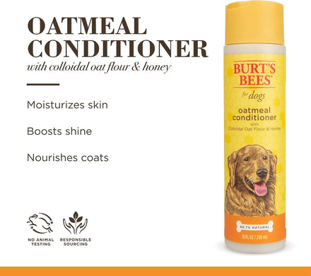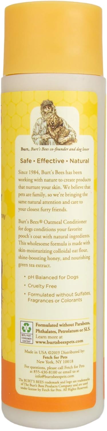 Product Description Since 1984, Burt’s Bees has been working with nature to create products that nourish your skin. With the same mission in mind, we created a custom formulated range of puppy shampoos to bring the same quality to the lives of our pets. Burt’s Bees™ for Pets™ Oatmeal Conditioner for Dogs with Colloidal Oats and Honey leaves your pet's skin soothed, moisturized, and softer than ever. Leveraging the power of naturally derived ingredients, colloidal oats and honey act as conditioners and regulate the delicate pH unique to pets, delivering a high shine finish. All our dog grooming products utilize 95%+ natural origin formulas and are formulated without chemical detergents, phthalates, parabens, or sulfates. Our itch soothing dog conditioner is also formulated without added colorants and dyes. Burt’s Bees naturally derived pet grooming solutions keep pets clean and pet parents happy! Our dog conditioner is cruelty-free and made in the USA with global ingredients, using 80% post-consumer recycled bottles and responsible sourcing. We choose to formulate without harsh chemicals, while ensuring 95%+ natural origin formulas, pH balanced to effectively cleanse and nourish your pet. A good shake before each use is required. Directions: Shake well before use. Wet coat thoroughly with warm water. Massage conditioner into your dog’s coat, working from the back of ears to tail and being careful to avoid contact with eyes. Rinse thoroughly and towel dry. brand_description Burt's Bees for Dogs