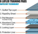 - LEAK-PROOF 6-LAYER DESIGN: Our dog pads are designed with a leak-proof plastic liner and advanced locking layers, these dog pee pads contain messes reliably and reduce odor - ideal for daily use with pets of all ages.