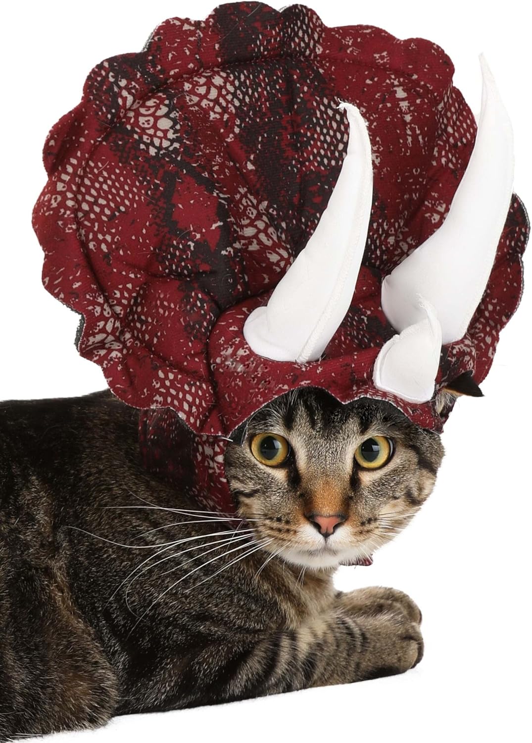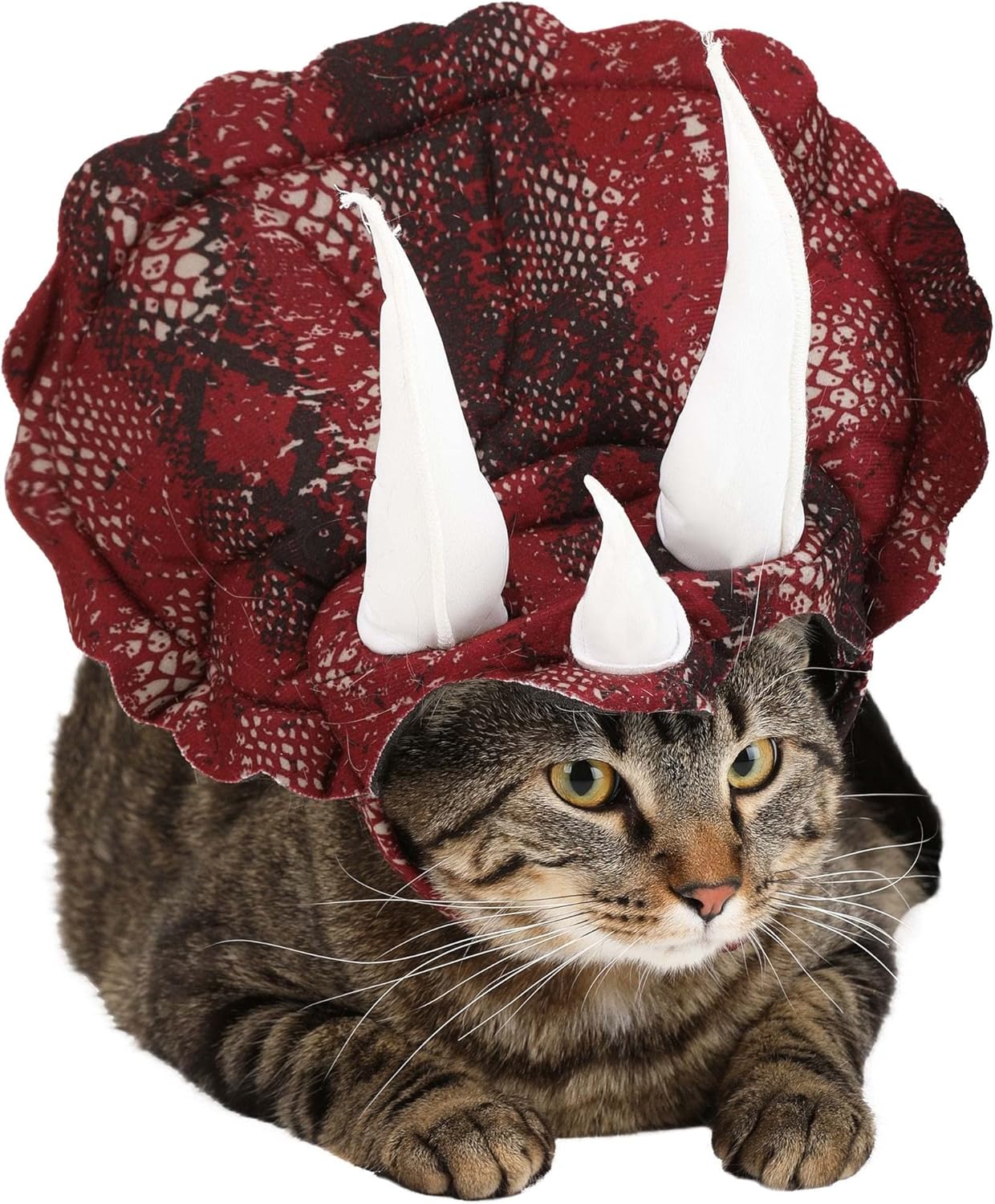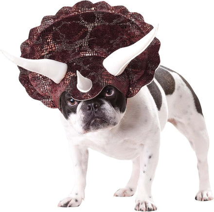 Your cretaceous canine. The triceratops costume includes dinosaur horned headpiece attaches with a Velcro strap under the dog's chin.