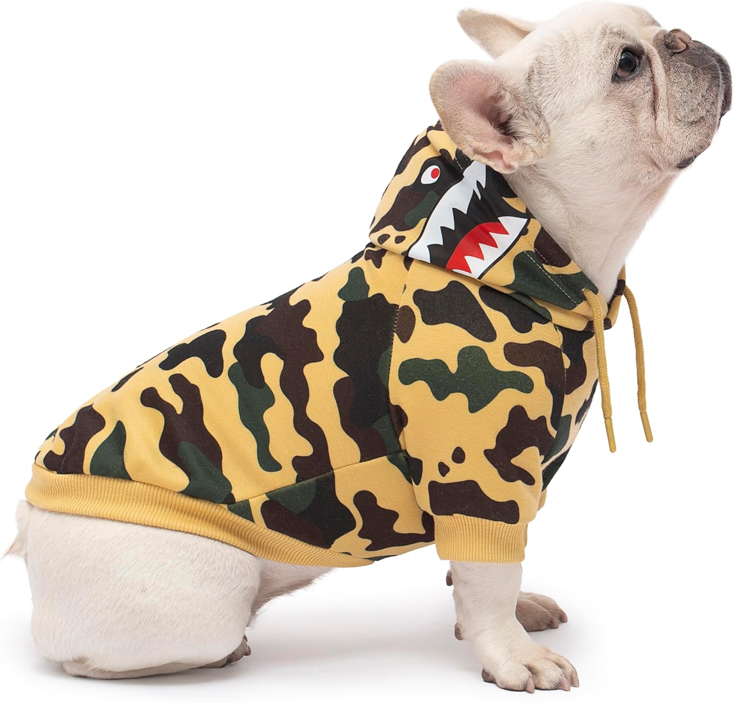Trendy Design: Inspired by WWII American fighter planes, which often had shark mouths painted on the front to intimidate enemy aircraft, this dog hoodie features a rugged camouflage pattern in earthy green and brown tones. The hood displays a fierce shark teeth graphic, echoing the bold style of those iconic planes and adding a playful yet intimidating touch. Perfect for adventurous pups with a bold sense of style!