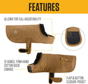 The Carhartt Firm Duck Insulated Dog Chore Coat is built for the toughest pups. Made with durable firm-hand duck canvas, this waterproof dog coat provides exceptional protection in wet, windy, and cold conditions. The water-repellent exterior shields your dog from the elements, while the dog jacket's quilted liner and corduroy collar ensure warmth and comfort during outdoor adventures. The new vent in the collar offers easy access and extra breathability. Designed for ease of use, improved neck and chest tabs allow for quick on and off, and the loop-lined straps provide a fully adjustable fit for maximum comfort. This durable weather-resistant coat is perfect for active dogs who need reliable protection from the cold, rain, and wind. Whether you're walking in the snow or braving a rainy day, the Carhartt Firm Duck Insulated Dog Chore Coat ensures your dog stays dry, warm, and stylish. Available in sizes from small to large, it’s the ideal winter coat for your pup.