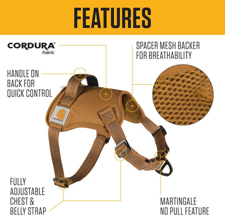 The Carhartt No Pull Harness is designed for both performance and comfort, offering a durable solution for your dog’s outdoor adventures. Crafted from tough 500-denier polyester keep your dog dry in light rain and wet conditions.The Martingale chest strap provides a no-pull function, making walks easier and more controlled. The over-the-head, yoke-style design ensures a secure fit, while the fully-adjustable chest strap allows for a customizable, comfortable wear. With reflective low-light stitching, this harness boosts your dog’s visibility in low-light conditions for added safety. Perfect for active dogs, the Carhartt No Pull Harness combines style, practicality, and rugged durability