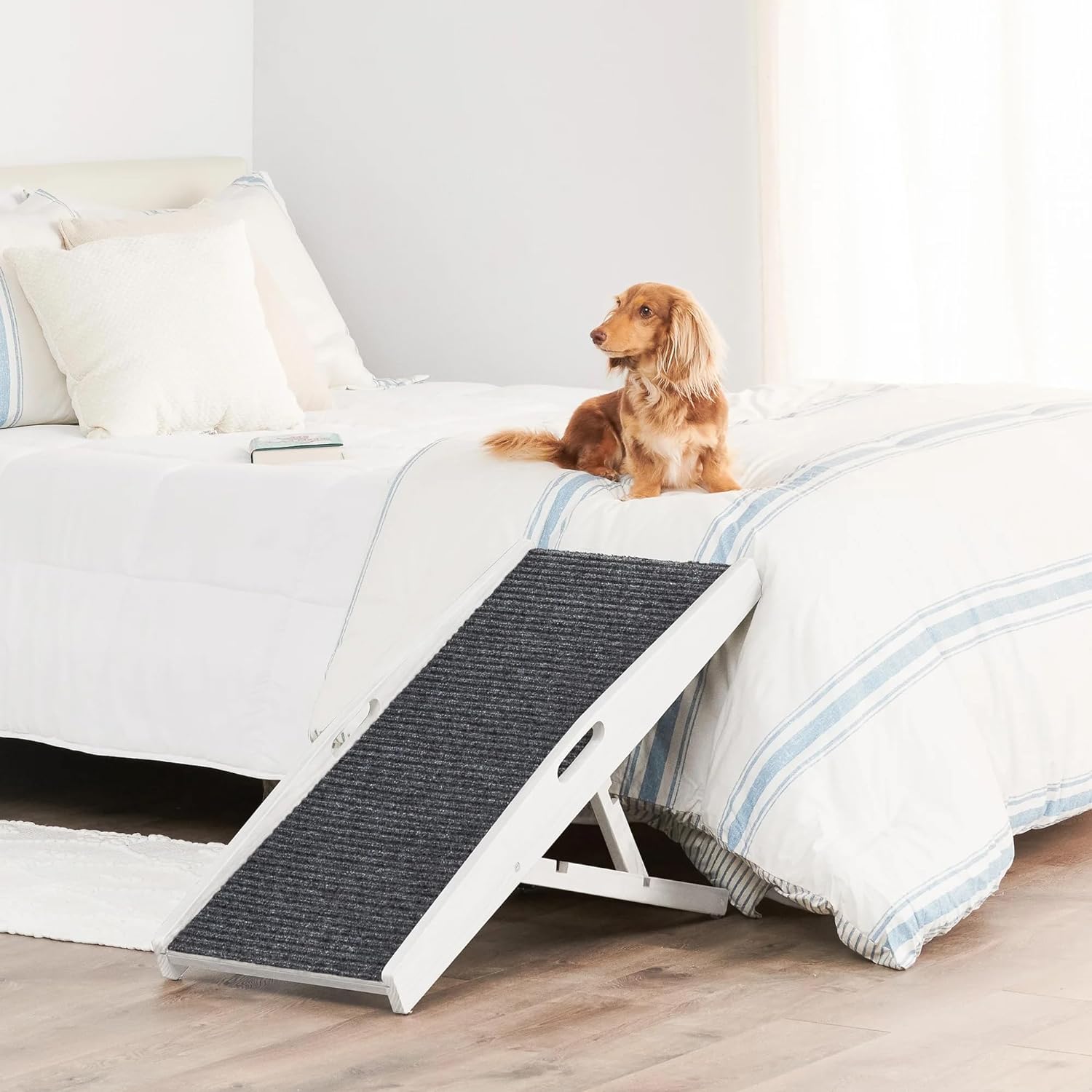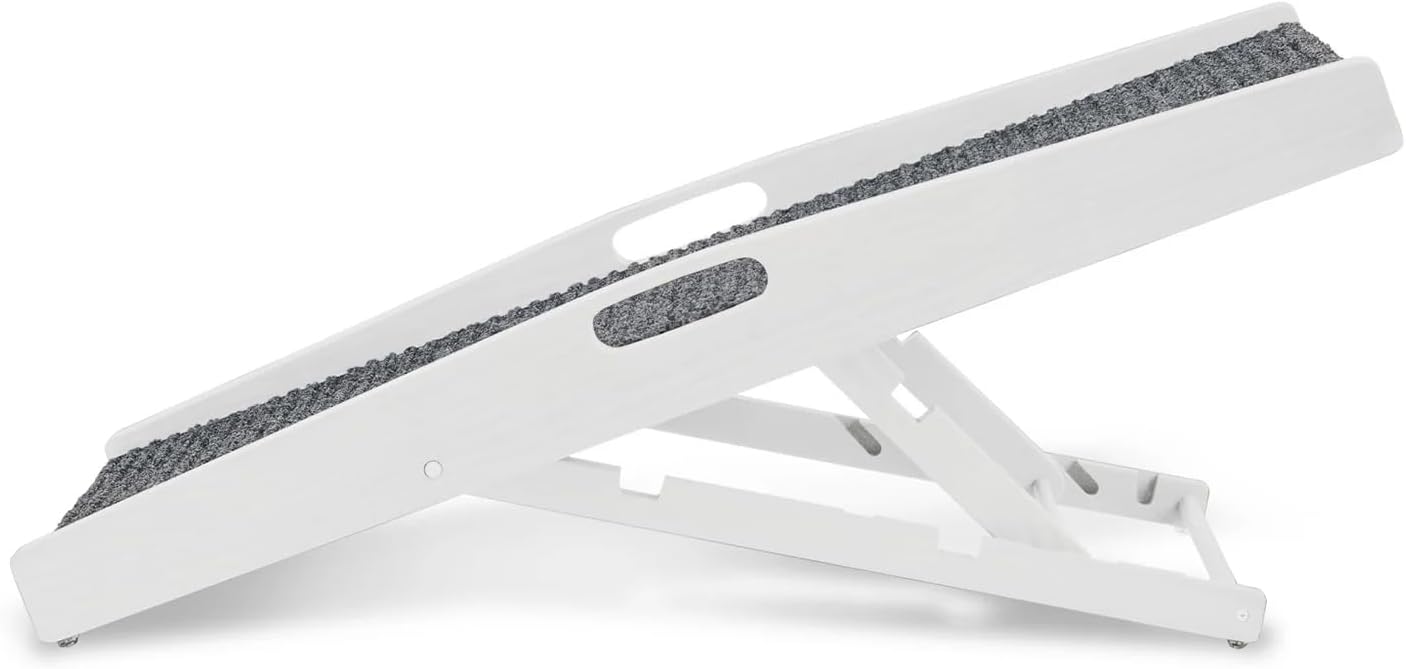 - ADJUSTABLE: The height of the ramp can quickly be adjusted to 12”, 16”, 20”, and 24” to be used with many different surfaces around the house. Rubber feet to keep the ramp in place.