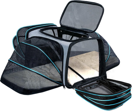 - Expandable Cat Dog Carrier Bag: Please measure your pet before purchasing! The cat carrier normal size is 19.5"Lx 12"Wx 12"H, Can be expanded to 43" Lx 32"W x 12"H by expanding the 4 mesh windows. It fits pet up to 19”L*11”W*11”H and MAX LOAD of 20lbs.