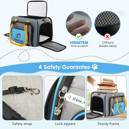 - SAFE & EASY FOR PET TRANSPORT:Our cat pet travel carrier comes with an inner safety leash to prevent your pet from escaping. The materials is mainly made with safe oxford cloth. The crate also features storage pockets on both sides for storing pet snacks, toys, food