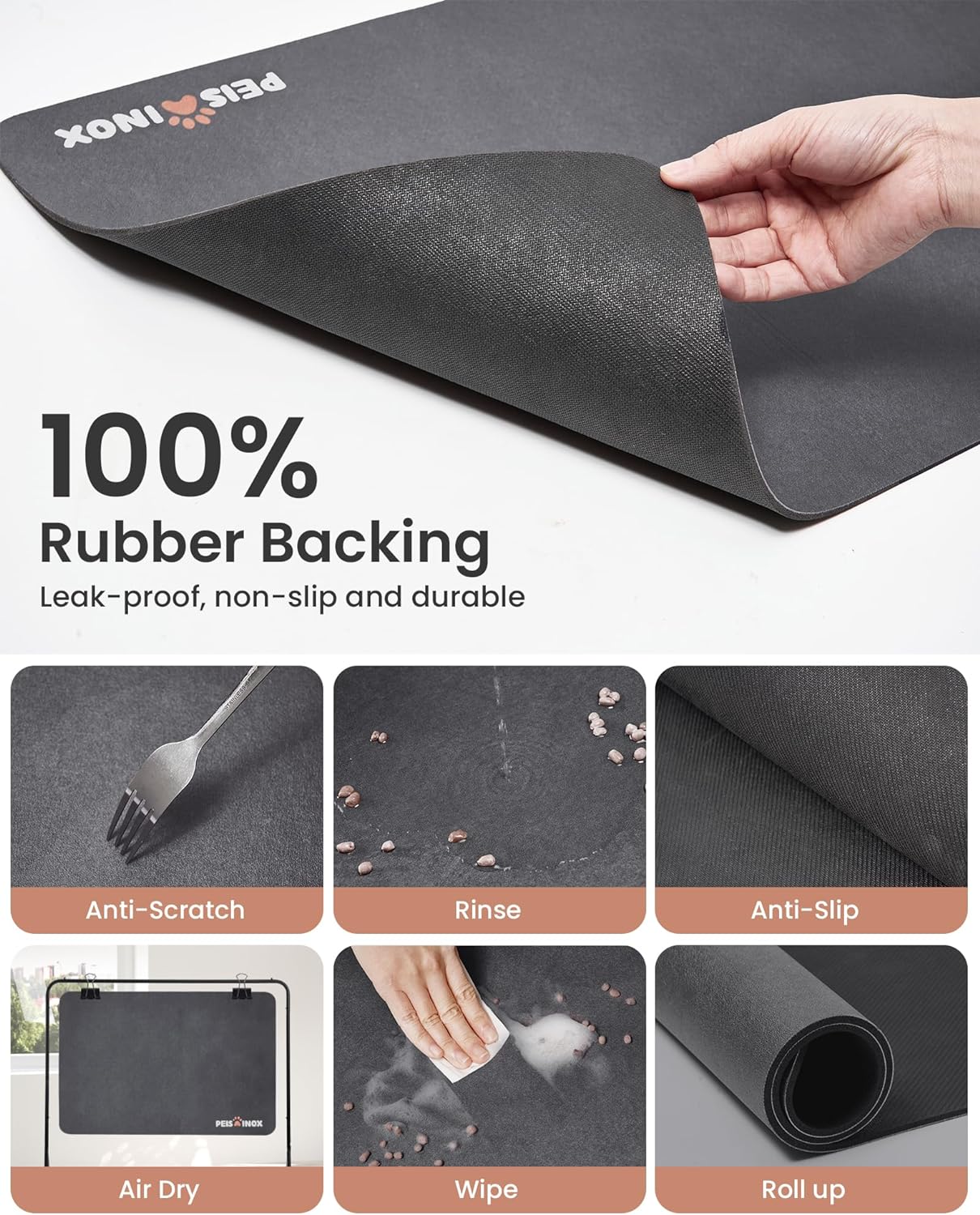 - 🐾INNOVATIVE MATERIALS - The cat food mat utilizes four layers of innovative materials, featuring a smooth and soft surface that is resistant to deformation. The rubber bottom layer effectively prevents water leakage, providing leak-proof and slip-resistant qualities. Unlike traditional silicone pet mats, paw prints and stains won't spread, keeping the floor clean.