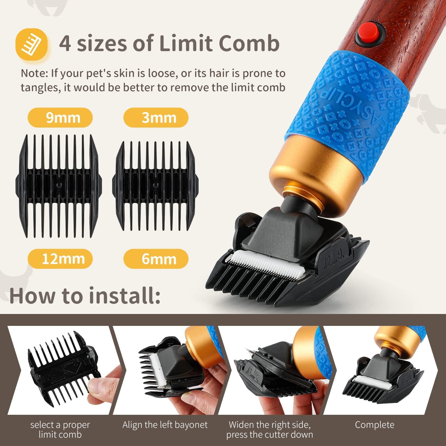 - Remove the Limit Comb: if you find the clipper doesn't work well when trim the pet’s hair with the the limit comb, please remove the comb first and try to clip the pet's hair with the clipper directly. The clipper equipped with the limit comb is only suitable for sparse pet's hair.