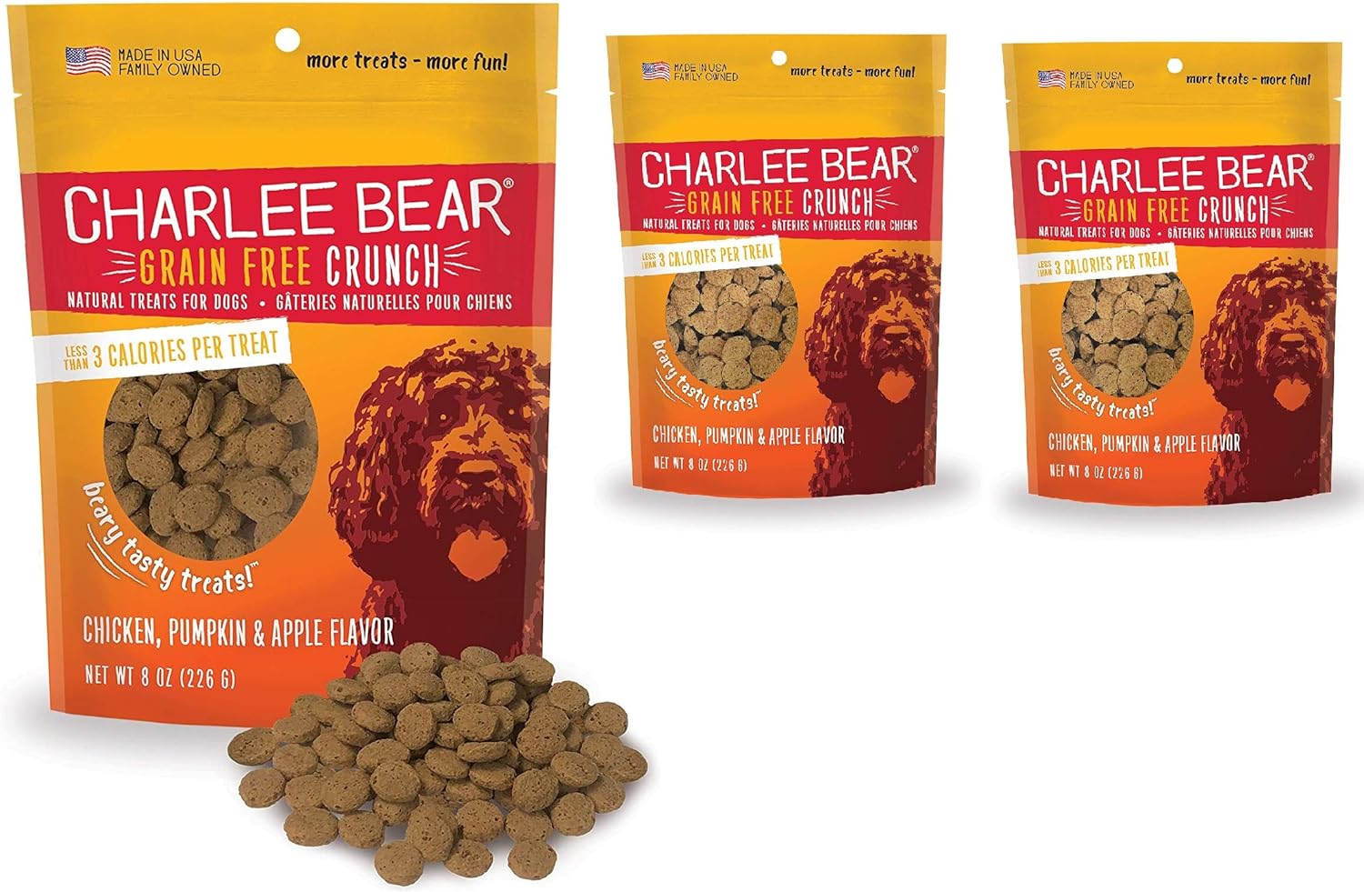 Charlee bear products continues its tradition of dog treats with a healthy purpose. At less than 3 calories each you can feel good treating your dog for training or just for fun. They're pocket perfect. Bear crunch is made to provide a special light crunch dogs love. We combine the tastes of chicken and pumpkin with the sweetness of apples. You and your dog will love bear crunch! this is a 2 pack.