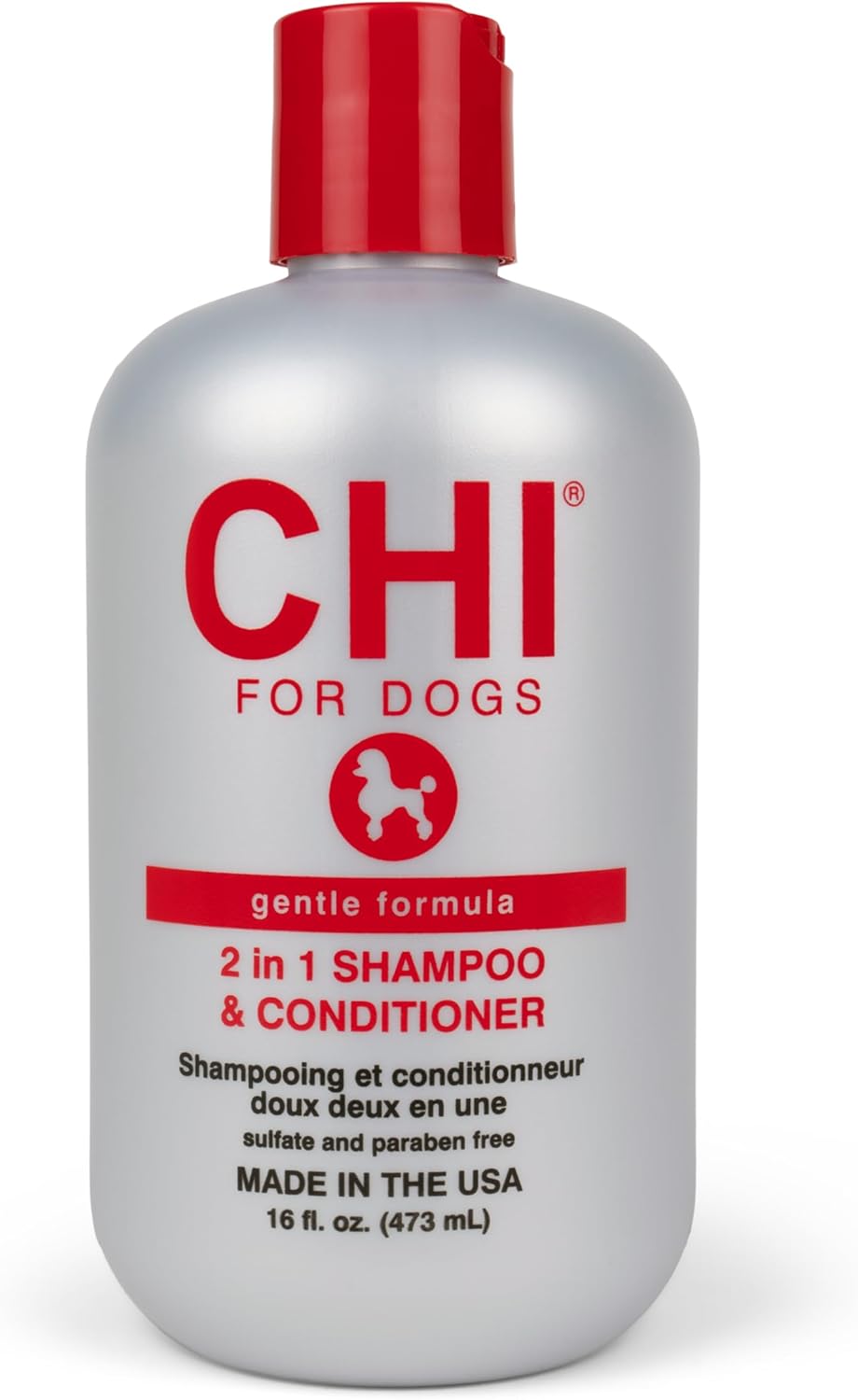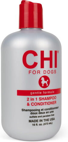 CHI for Dogs Gentle Formula 2-in-1 Shampoo & Conditioner is luxurious and pH balanced for all dogs. It helps remove debris and dirt while restoring shine, luster, and softness to your dog's coat and skin. In one easy step, your dog will look and feel their best. Wet coat thoroughly with warm water. Apply shampoo from back of ears to tail, carefully avoiding eyes. Lather and gently massage into coat and skin. Rinse well. Repeat as necessary. For external use only. Safe for dogs 8 weeks of age and older. Keep out of reach of children and pets. CHI for pets uses premium quality, pH balanced formulas to deliver luxurious results. Grooming products are designed to optimally care for your pet's skin and coat. All products are developed with the same superior technologies as the professional salon CHI human lines, but with specialty adaptations just for pets. CHI delivers pets salon quality results right at home. Grooming products bring moisture and balance by penetrating the coat's cuticle and strengthening the fur follicles from the inside out. High quality grooming tools are designed to help restore hair's natural shine, reduce static electricity, minimize shedding, and manage tangles. CHI makes it easy for pets to luxuriate in softer, healthier and more beautiful coats.