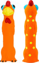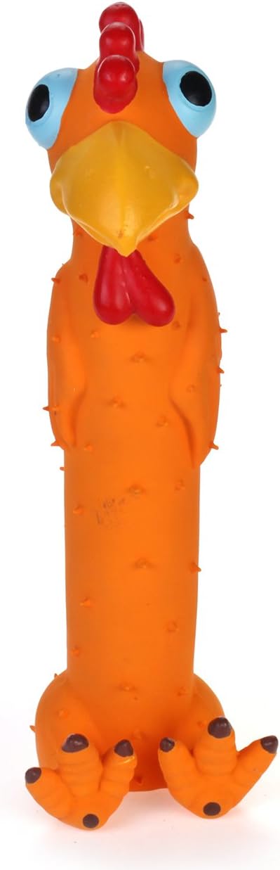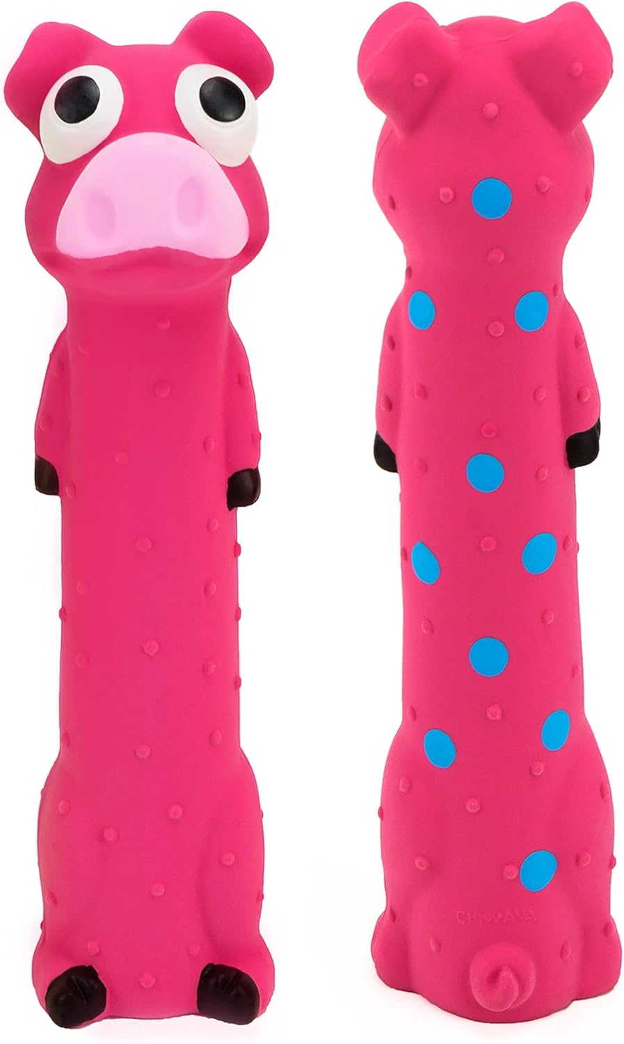 Chiwava toys are made from Latex,NON-TOXIC. Toys coating is pleasant to the touch and soft, easy to clean. Toys come in set of 3 bright colors (rose red, orange and green) with funny cute animal faces (piggy, chicken and frog). toys have long-body shape and because of rubber, can stretch and tug without breaking it, have small squeaker which makes high sound when you squeeze it.