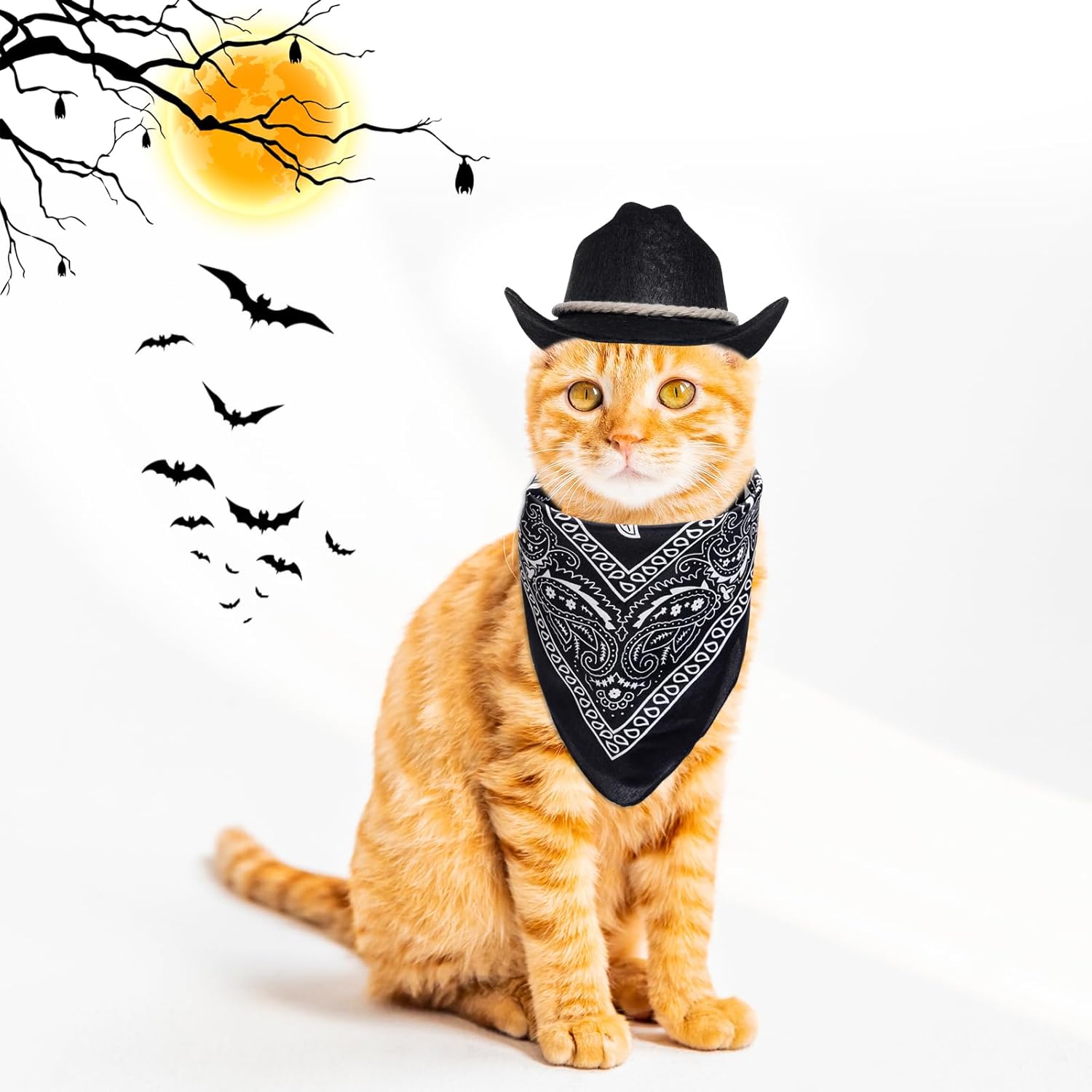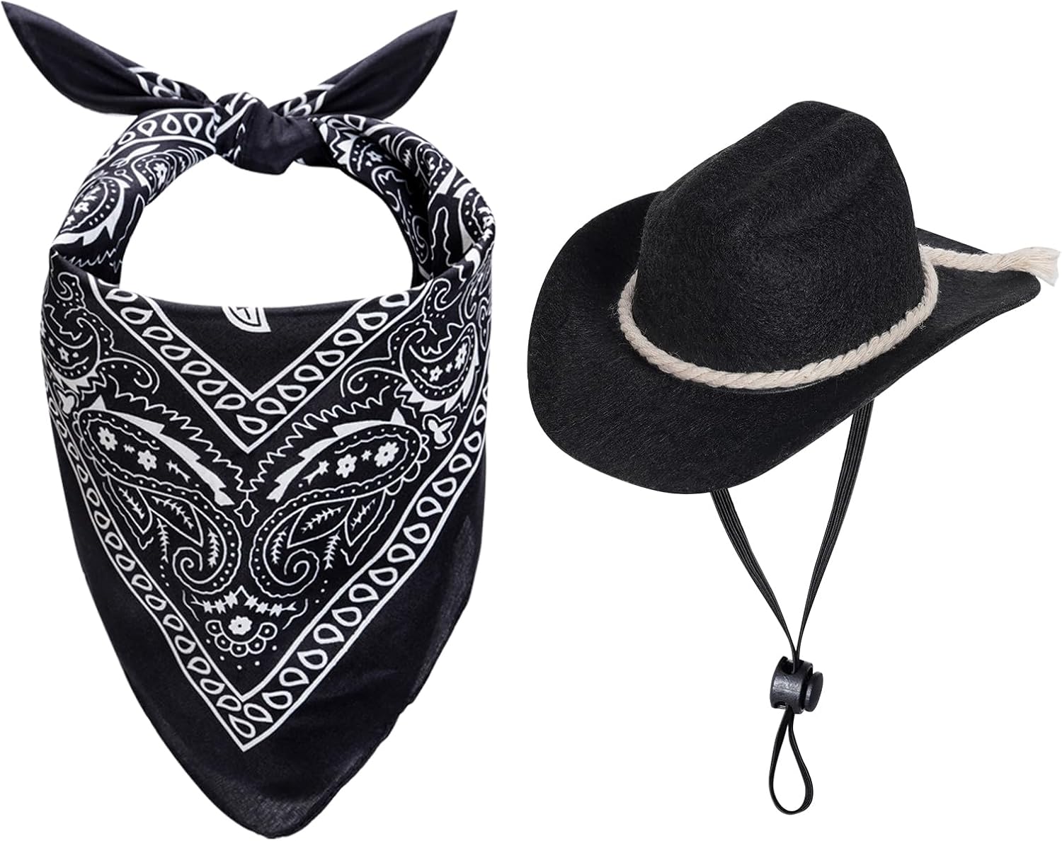 - PACKAGE INCLUDED:you will receive a black cowboy hat decorated with cotton rope and a black bandanna, stylish and retro design turns your pet into a cute, handsome cowboy in no time, very suitable for your pet halloween costumes.