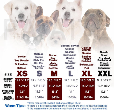 - Sizes: The hoodie is available in different sizes to fit small to medium-sized dogs. Be sure to measure your dog's chest and neck girth before purchasing to ensure the best fit. The size chart can help guide you in choosing the right size for your pup.