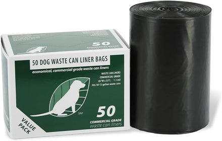 Commercial Grade Dog Waste Can Liners, 200 bags per case. Our liners are made with a star seal bottom for extra strength. Passes the 'puncture test'. Liners are black opaque, so you can't see through! Standard Size: 26"W x 33"33L, 1.1 mil heavy duty, 50 bags per roll - each roll individually boxed / 4 boxed rolls per case. Bag size: 26"W x 33"L, Roll Size: 7.375"W x 6.375"D, Thickness: 1.1 Mil, Case Weight: 15 lbs, Liner Color: Black, Opaque