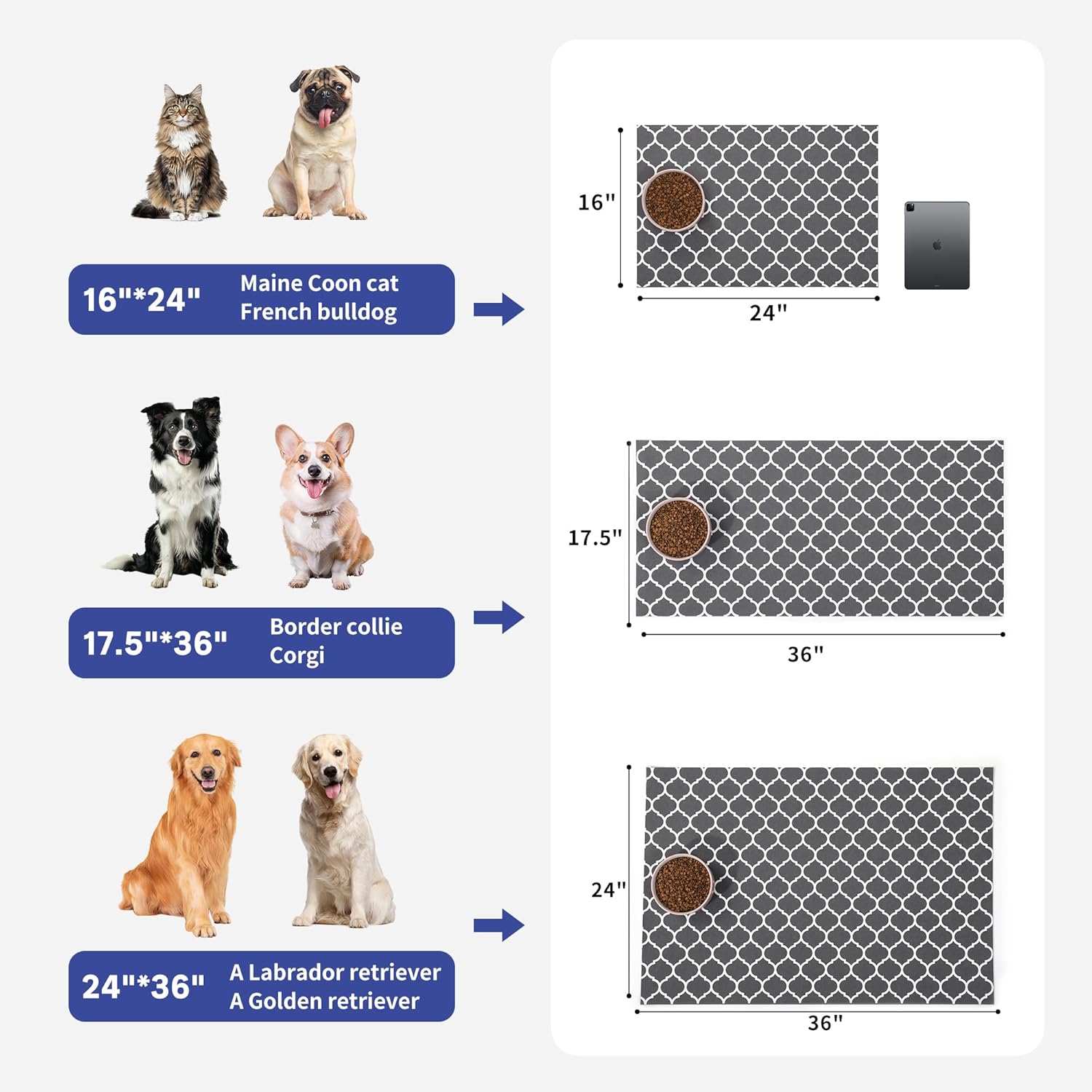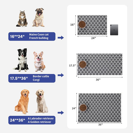• Multiple Colors and Sizes: This dog bowl mat is available in 3 convenient sizes, including 16” x 24”, 17.5” x 36” and 24” x 36”, depending on your needs, covering a wider surface for better floor protection. Choose from 2 cute and fun patterns with grey or khaki colors, adding a modern touch to any decor!