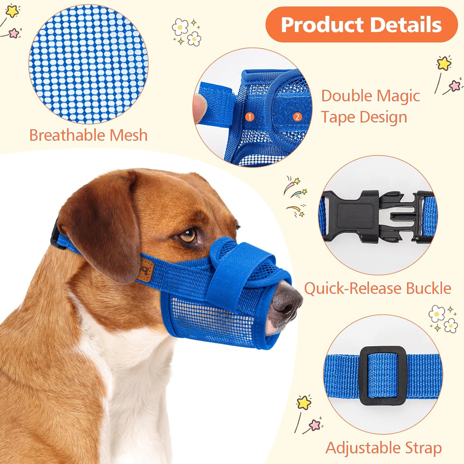 - Adjustable for Perfect Fit: This small dog muzzle comes with dual adjustment options for a secure and comfortable fit. The snout area features an adjustable magic tape, while the neck strap has an adjustable buckle for a snug yet gentle fit. The quick-release buckle makes putting it on and removing it a breeze.