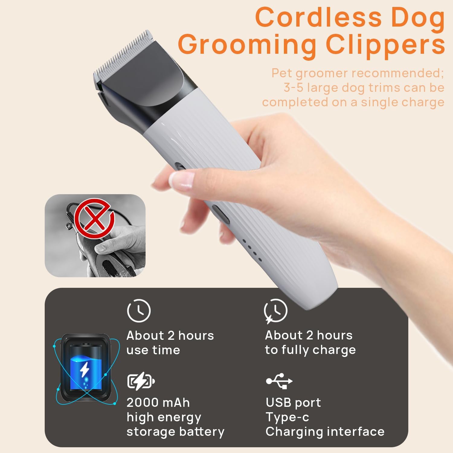- Motor profesional de 3 velocidades para todos los tipos de abrigo: 4600 RPM (capas finas) | 5600 RPM (regular) | 6600 RPM (piel densa) Batería de 2000 mAh: más de 300 minutos de uso de recortadora inalámbrica para mascotas; carga rápida USB-C en 2 horas.