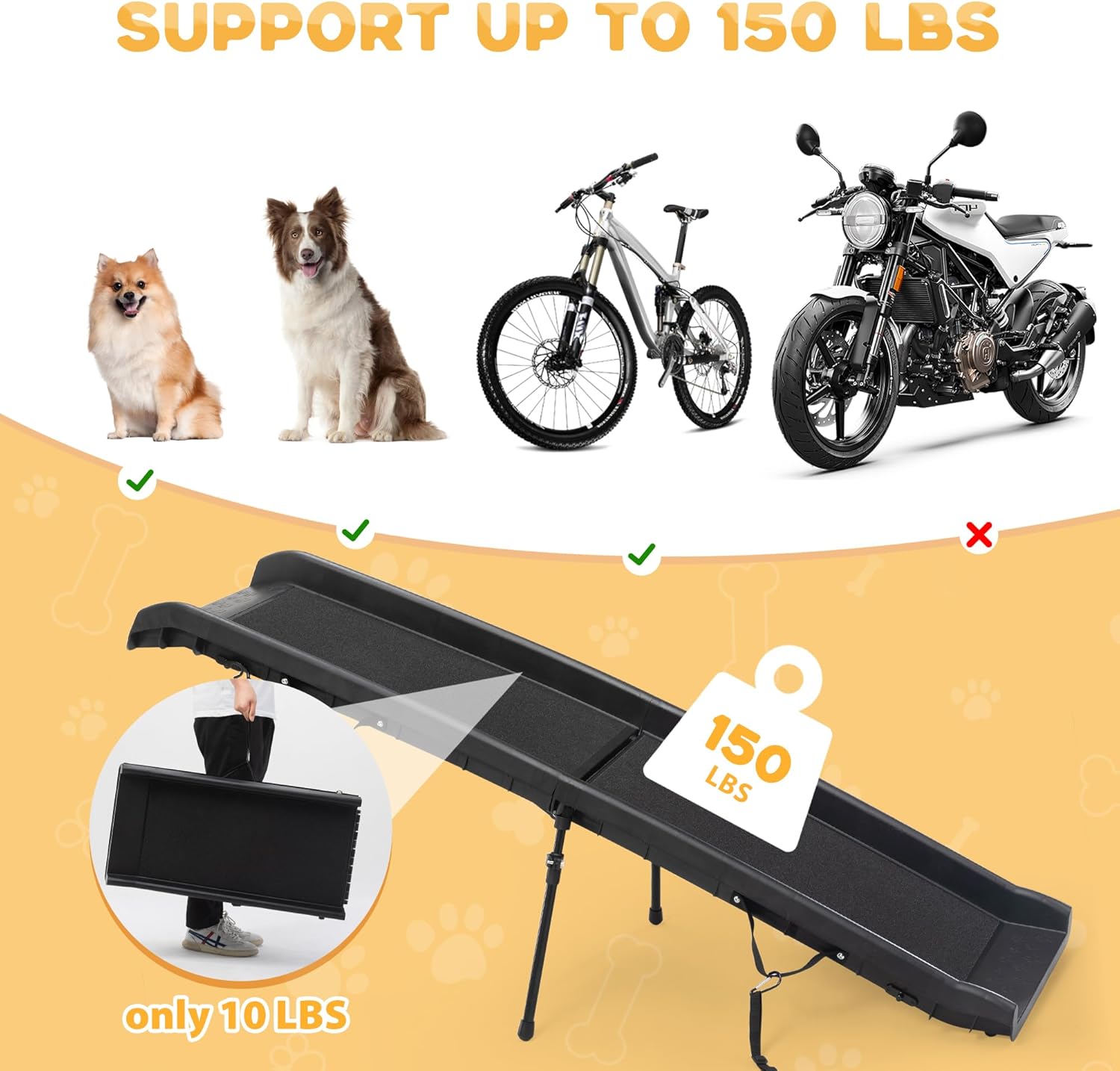 - Safety Tested:This Dog Ramp for SUV is independently tested. Weighs only 10 pounds and rated to support 150 pounds. With adjustable support feet(removable), heights ranging from 11.81"to 19.68", providing stable support for your fur kids while climbing