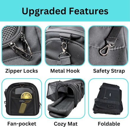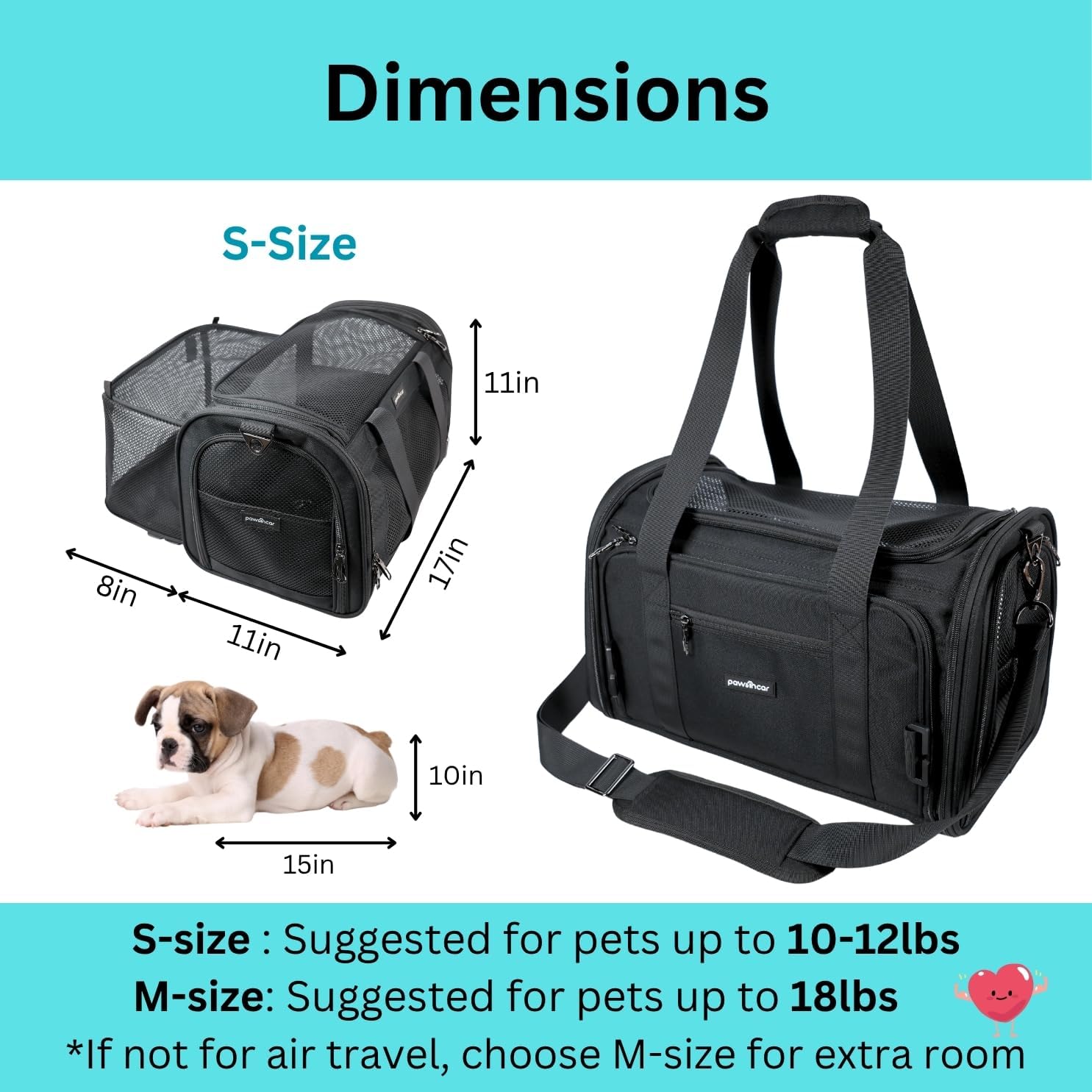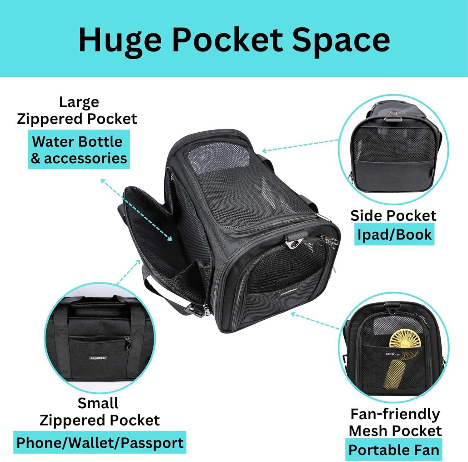- Airline-Approved: This airline-approved dog carrier is suitable for in-cabin pet travel with most airlines. You can place this dog travel bag under the seat in front of you. With our unique design, you can put a portable fan inside our fan-friendly mesh pocket to increase airflow. You can also expand our small-sized carrier under seat or underseat (as it is an expandable pet carrier) to provide more space and airflow for your dogs and cats, provided that the airline's air helper doesn’t restrict you. Please check your airline's specific size requirements before making a purchase (airline-approved cat carrier, pet carrier airline approved, TSA airplane approved).