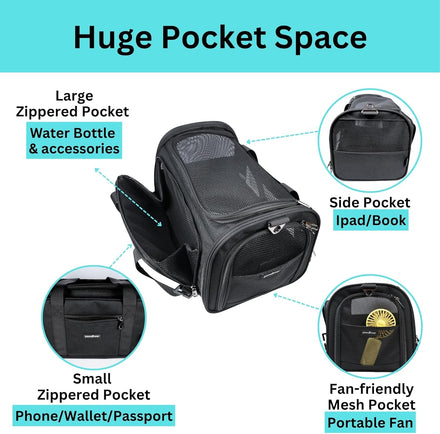 - Huge Pocket Space: Equipped with 4 pockets: one large zippered pocket for carrying bigger items, one small zippered pocket for essentials like a wallet, one fan-friendly mesh pocket for placing a portable fan, and one wide side pocket for other pet supplies. Our cat carriers offer one of the largest pocket storage options among other brands and can accommodate all dog travel accessories as well as all cat accessories for travel.