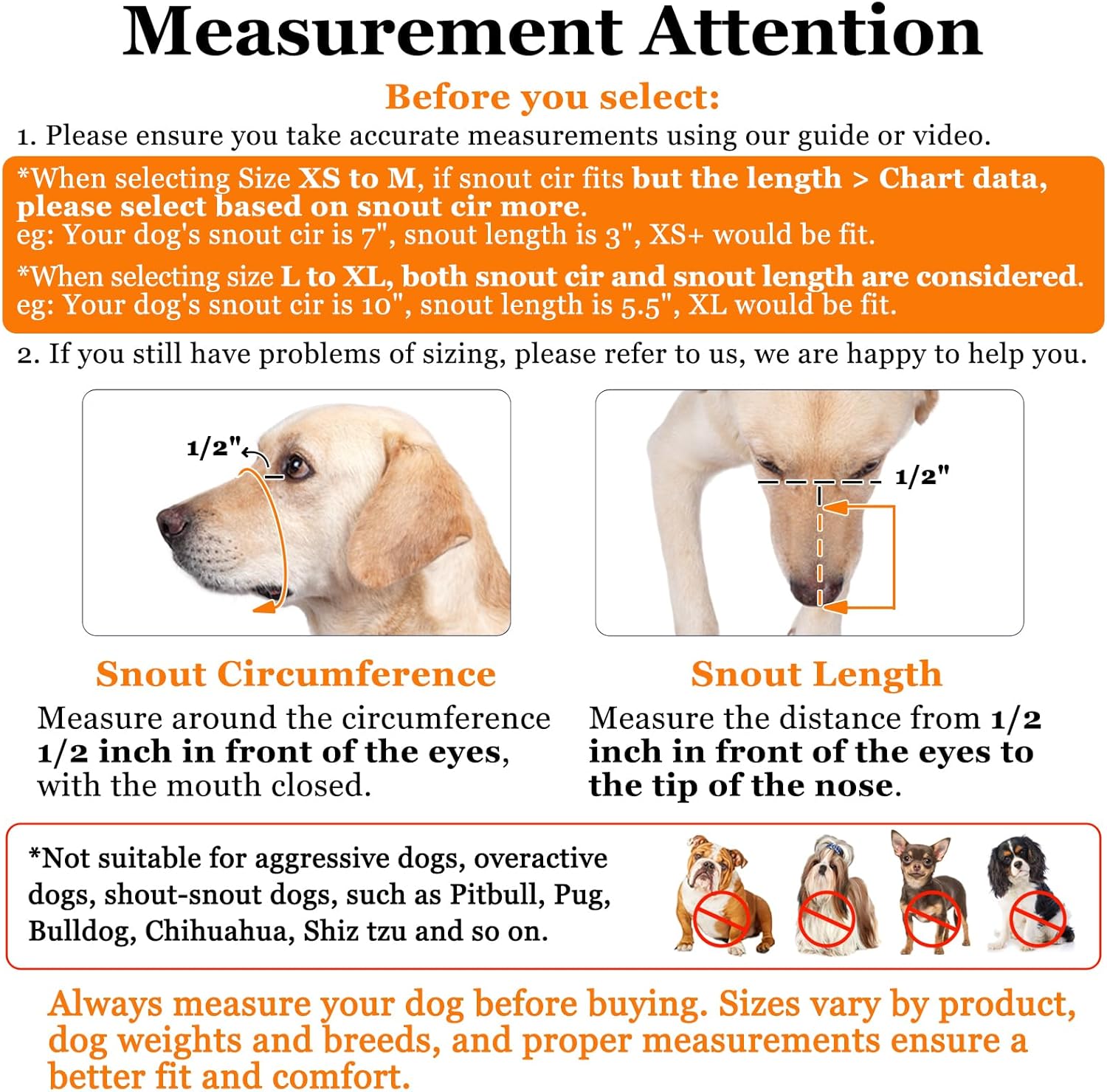 - How to measure: Use a soft tape measure to measure your dog's snout circumference and length. The measurement should be taken 1 inch away from the eyes. If your dog's measurements fall between two sizes, choose the larger size.