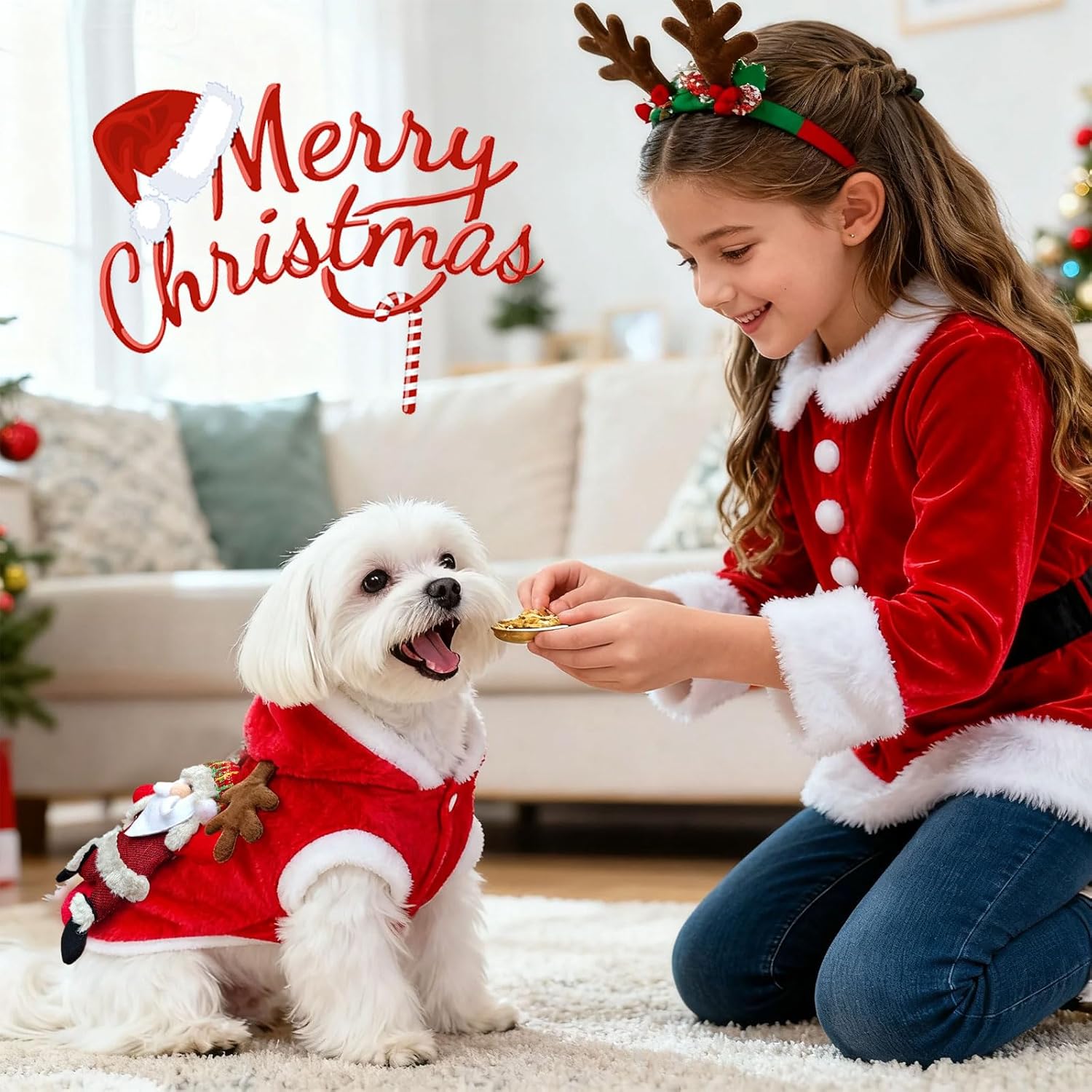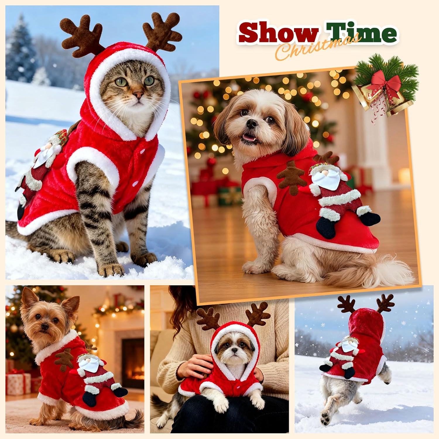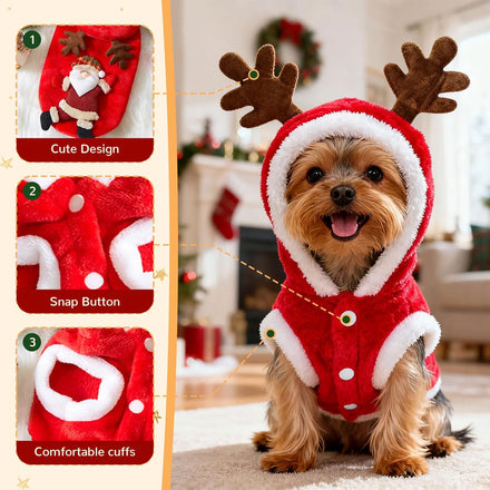 • Cute Small Dog Christmas Hoodie Costume:Transform your beloved pets into the embodiment of Christmas joy with our exquisitely designed hoodie. The highlight is an adorable, intricately crafted Santa Claus decoration displayed on the back, radiating classic holiday charm. Topping it off is an irresistibly cute hood featuring two soft-to-the-touch reindeer antlers. Whether posing for the annual Christmas card or greeting guests, your pup will effortlessly steal the show, spreading warmth and laughter with every playful step