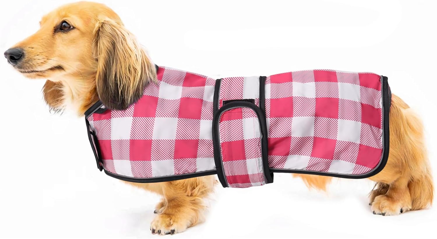 1. Dachshund rain coat - This is made specifically for the long back of a miniature standard dachshunds, weiner, corgi and similar long back breeds. Light weight and waterproof, put it on doesn’t seem to bother them.