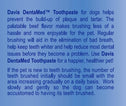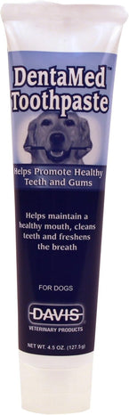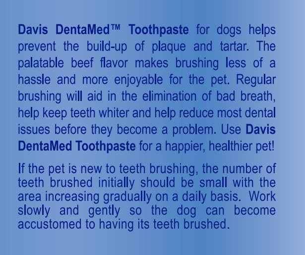 Davis DentaMed Toothpaste for dogs helps prevent the build-up of plaque and tartar. The palatable flavor makes brushing less of a hassle and more enjoyable for the pet. Regular brushing will aid in the elimination of bad breath, help keep teeth whiter and help reduce most dental issues before they become a problem. Use Davis DentaMed Toothpaste for a happier, healthier pet! If the pet is new to teeth brushing, the number of teeth brushed initially should be small with the area increasing gradually on a daily basis. Work slowly and gently so the dog can become accustomed to having its teeth brushed.