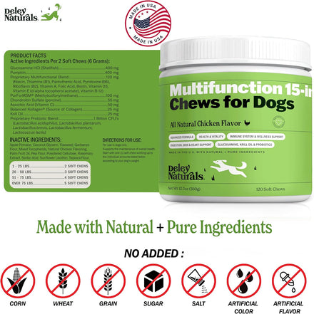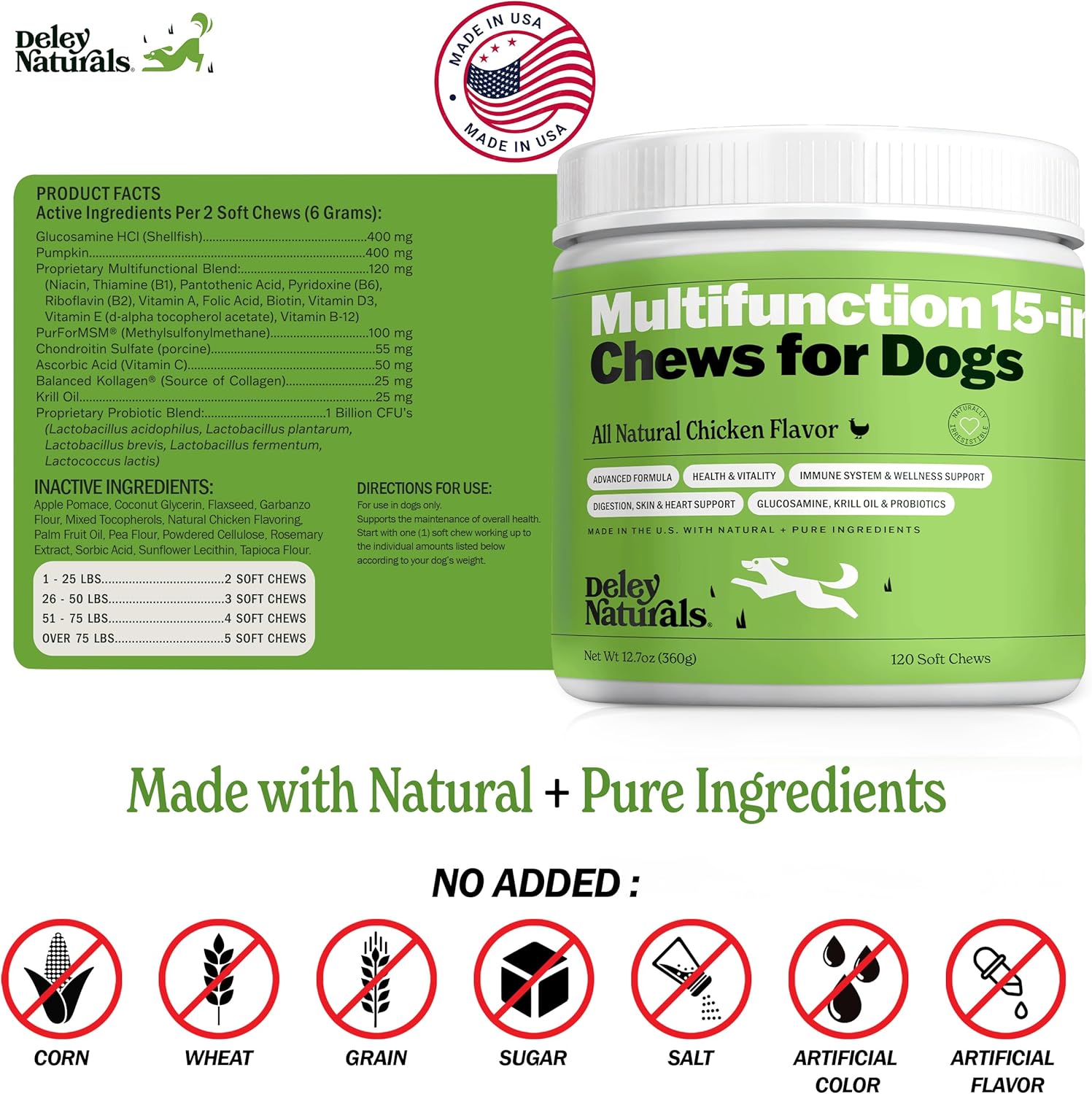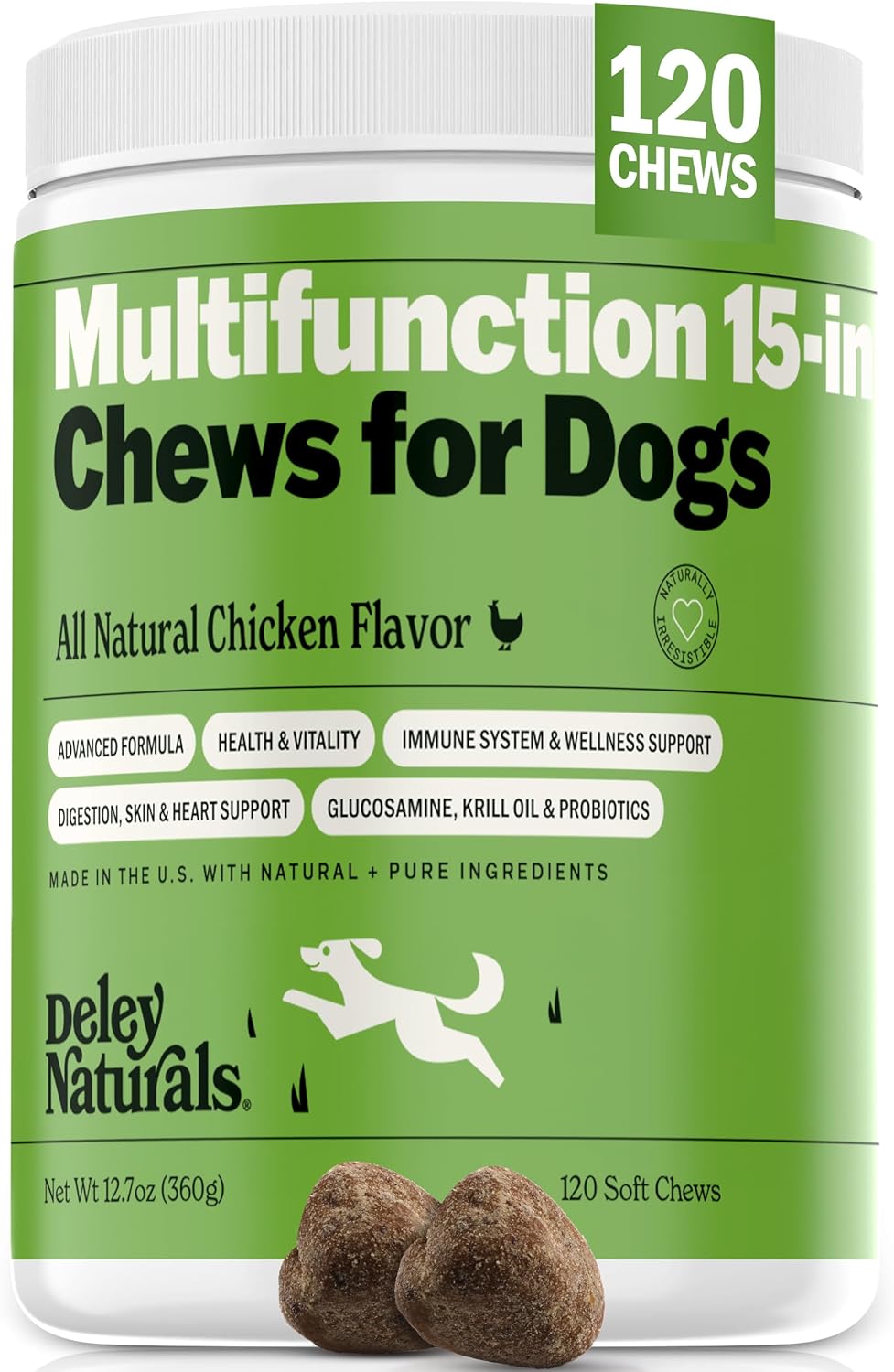 - POWERFUL NUTRIENTS - Deley Naturals 15-in-1 Multivitamin for Dogs provides essential vitamins like A, C, D, E, and B-complex, combined with minerals and probiotics in a delicious soft chew. These dog vitamins and supplements are designed to support the immune system, skin, coat, eyes, joints, heart, and digestion. Ideal for dogs of all ages, sizes, and breeds.