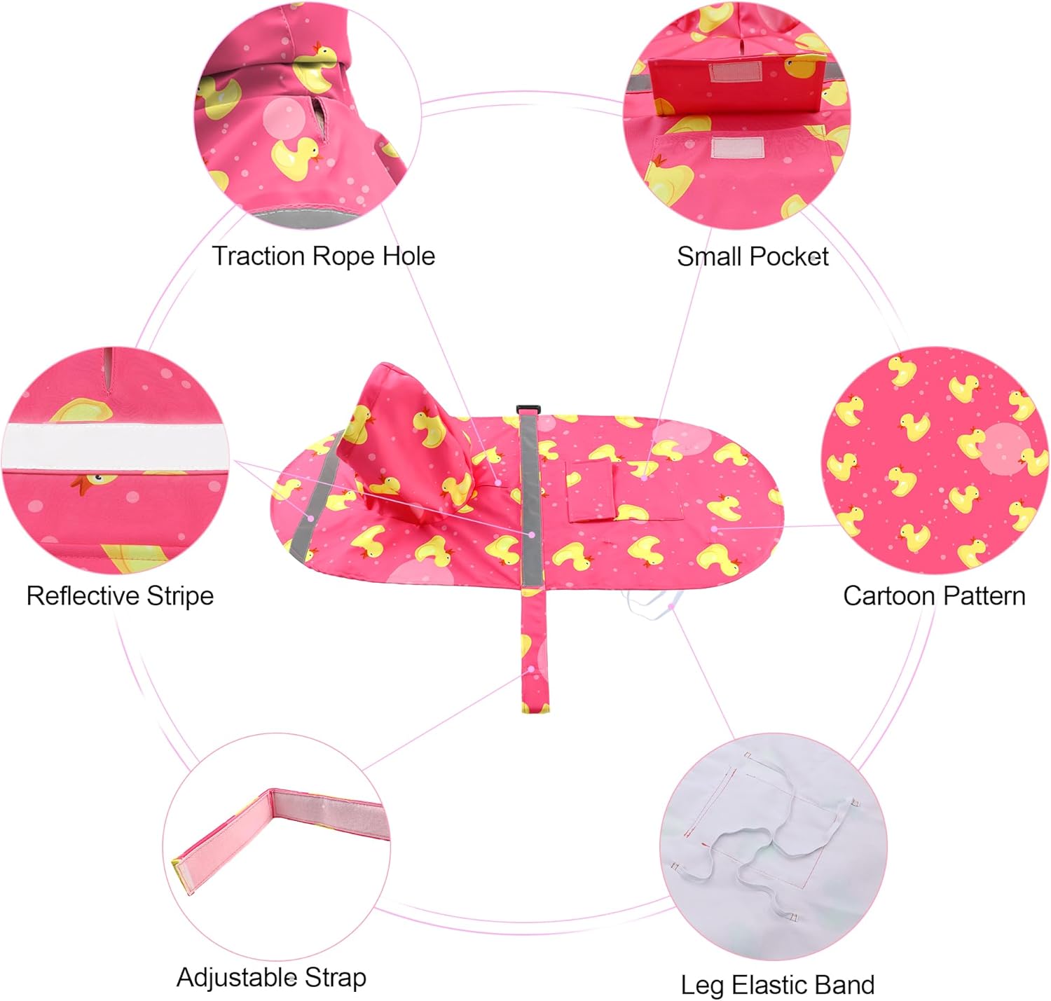 DELIFUR Large Dog Raincoat- Waterproof Dog Rain Poncho Adjustable Double Layer Rain Jacket with Hood for Medium Large Dogs Designed with Leash Hole Reflective Strip and Ducks (Pink Duck, Medium)
