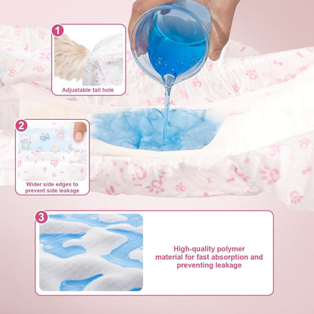 Pet diapers are ultra-absorbent to absorb urine quickly, and the 360° leak-proof design keeps pets comfortable no matter what the environment.
