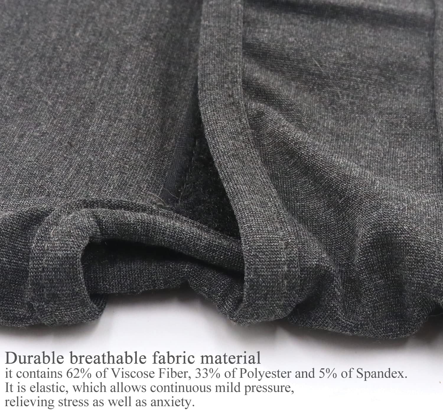 - 【SOFT MATERIALS】This anxiety relief vest made of durable breathable fabric, it contains 62% of Viscose Fiber, 33% of Polyester and 5% of Spandex. It is also elastic, which allows continuous mild pressure, relieving stress as well as anxiety.