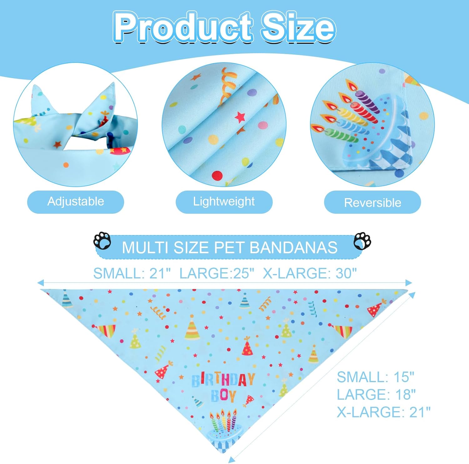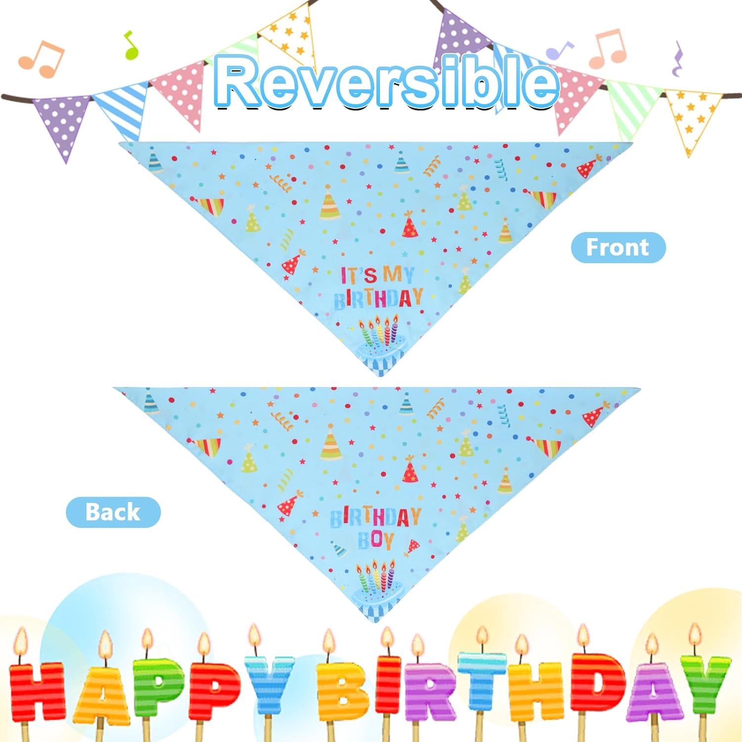 - Double Sided and Bright Design: The birthday bandana for dogs are double sided, one side has colorful letters are "It's my Birthday," and the other side has colorful letters print of "Birthday Boy".