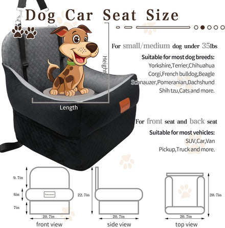 - 【IDEAL SIZE】Pets ride height 7 inches,dog car seat measures 20.7 inches (L) X 20.7 inches (W) X 22.7 inches (H). It's suitable for up to two small dogs or one medium sized dog weighing less than 35 pounds. Breeds suitable for this car seat include Yorkshire Terriers, Schnauzers, Corgis, French Bulldogs, Chihuahuas, Pomeranians, Dachshunds, Shih Tzus, puppies, cats, and more.
