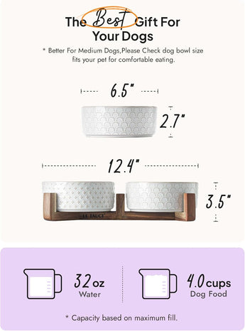 - Size And Capacity: Each single dog bowl measures 6.5" Dia and 2.7" H. It's wide enough. Normal capacity is 3 cups, limit capacity is 4 cups and it can hold 32 oz water. These wide pet bowls are suitable for small and medium sized dog and cat, puppy, kitten, rabbits, etc