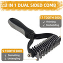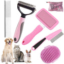 - A variety of different de-shedding tools:1. dog cat self-cleaning grooming brush can easily for pets shedding effortless; 2. double-sided de-shedding rake to remove the undercoat of the dog and cat, to reduce hair loss; 3. bathing brush to thoroughly clean and massage every inch of the pet's hair ;4. coarse and fine tooth row comb for pet grooming styling, to remove the undercoat knotted tangled ;5. flea comb to remove fleas