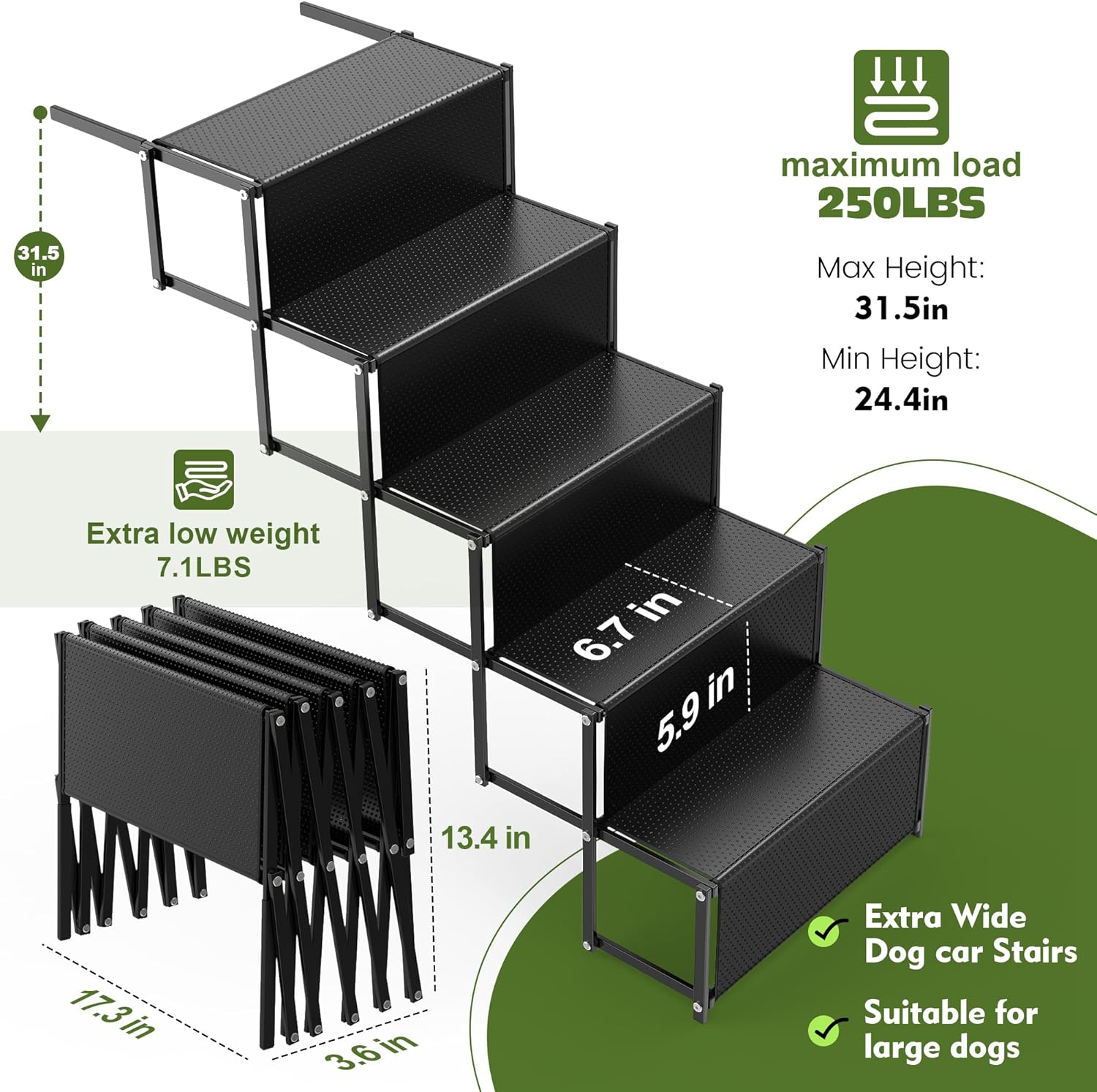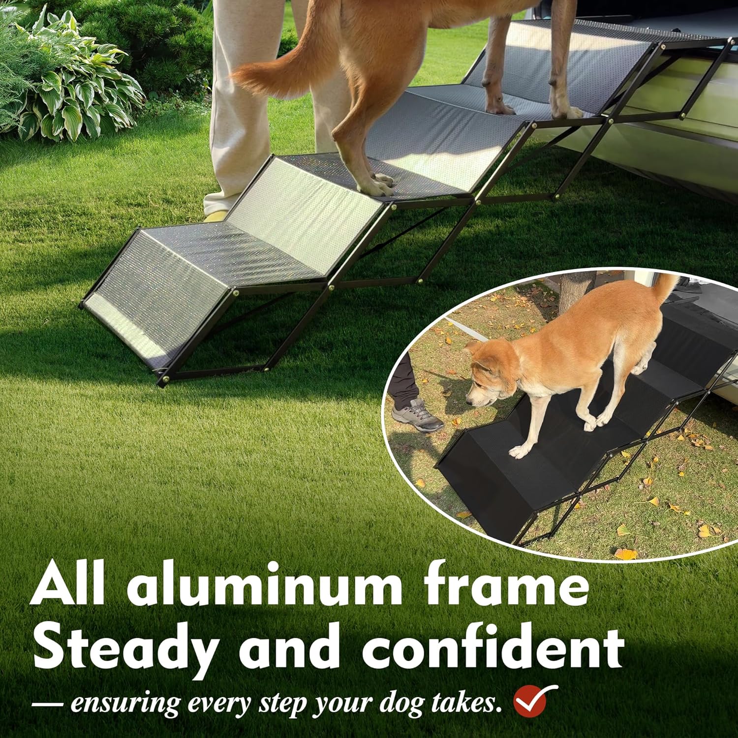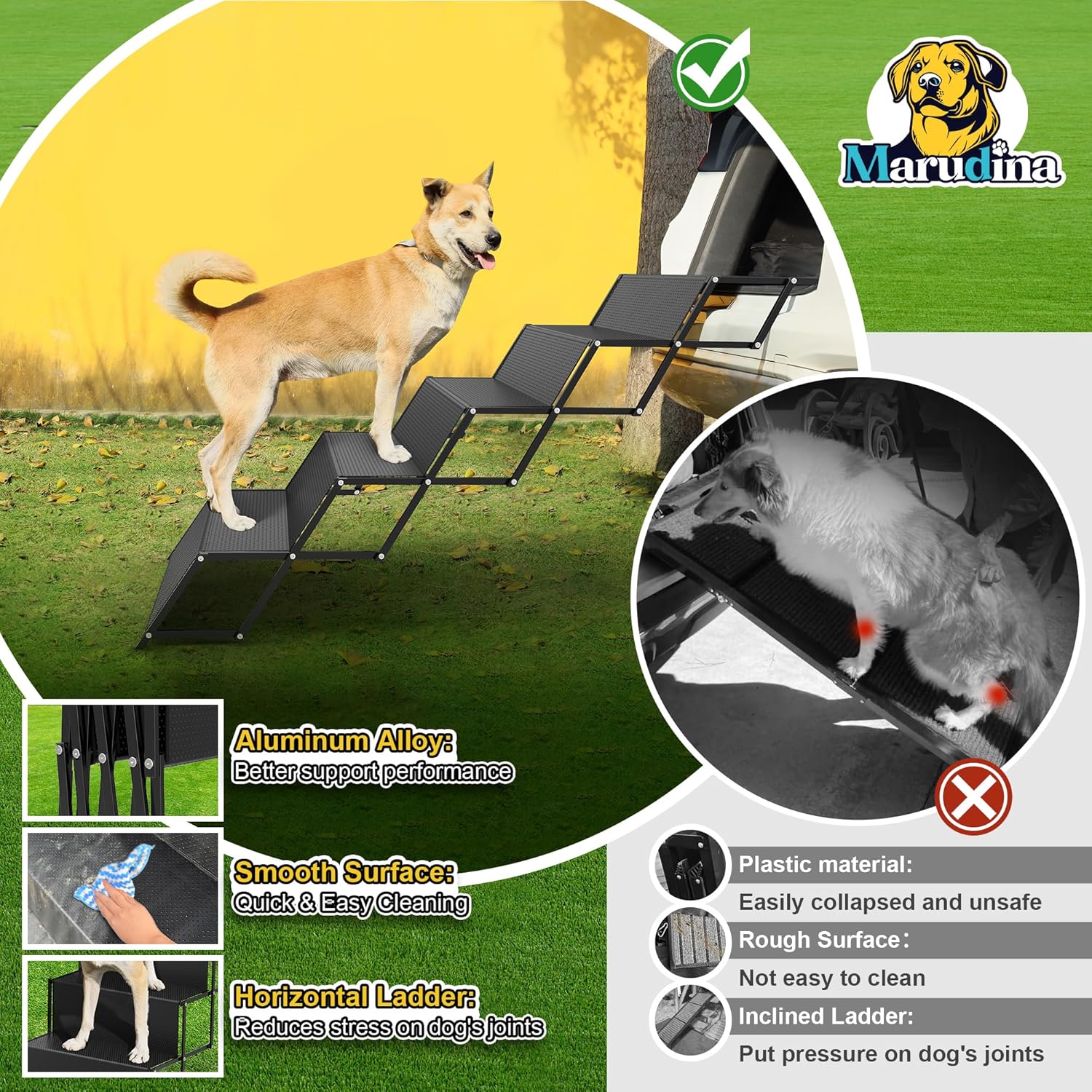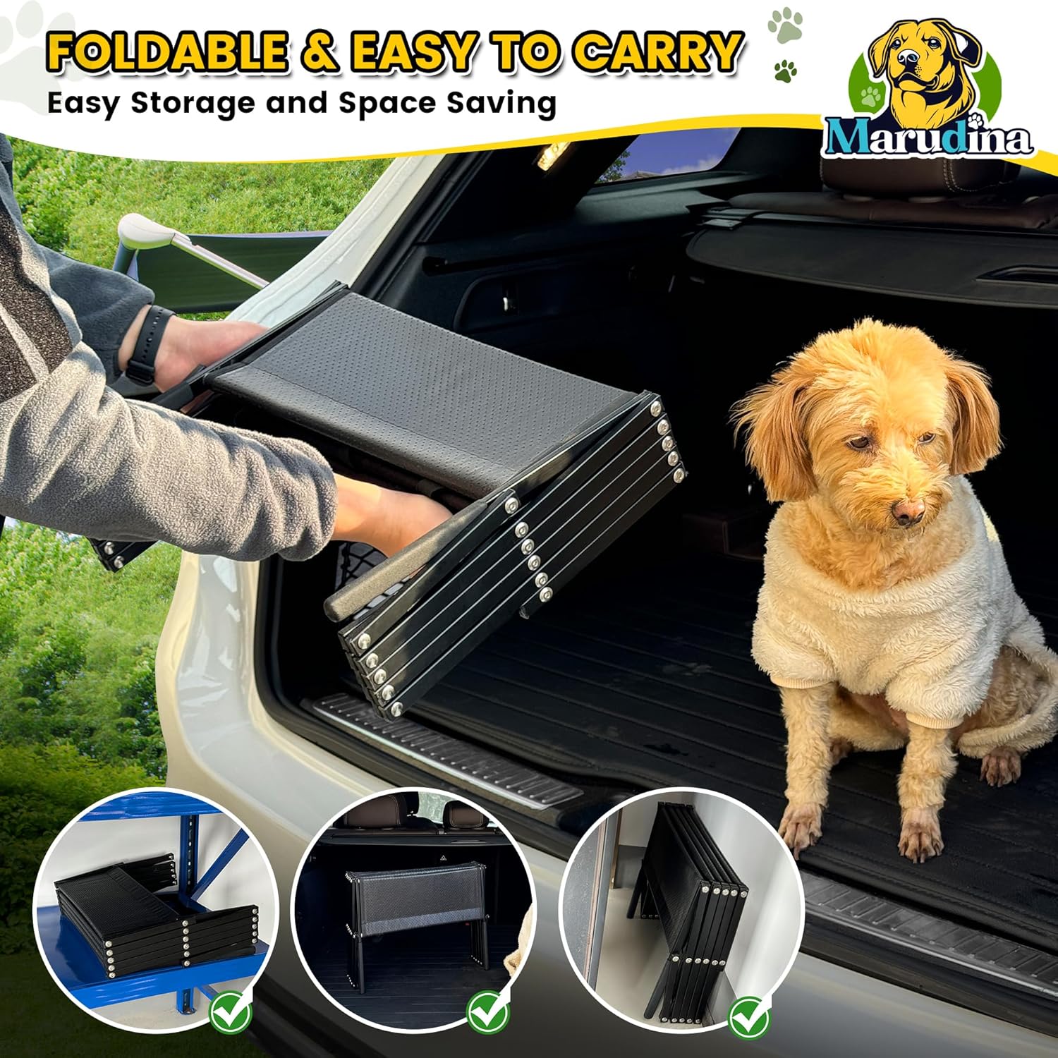 - Ideal for Sturdy and Durable:Marudina Foldable Dog Car Ramps are made of high-quality aluminum alloy, with a stable structure and excellent support. Each step is carefully designed, durable and stable, and can bear up to 250 pounds, so even large or overweight pets can use it with confidence.Additionally, the ramp features an anti-scratch handle, preventing any damage or scratches to your vehicle’s interior during use