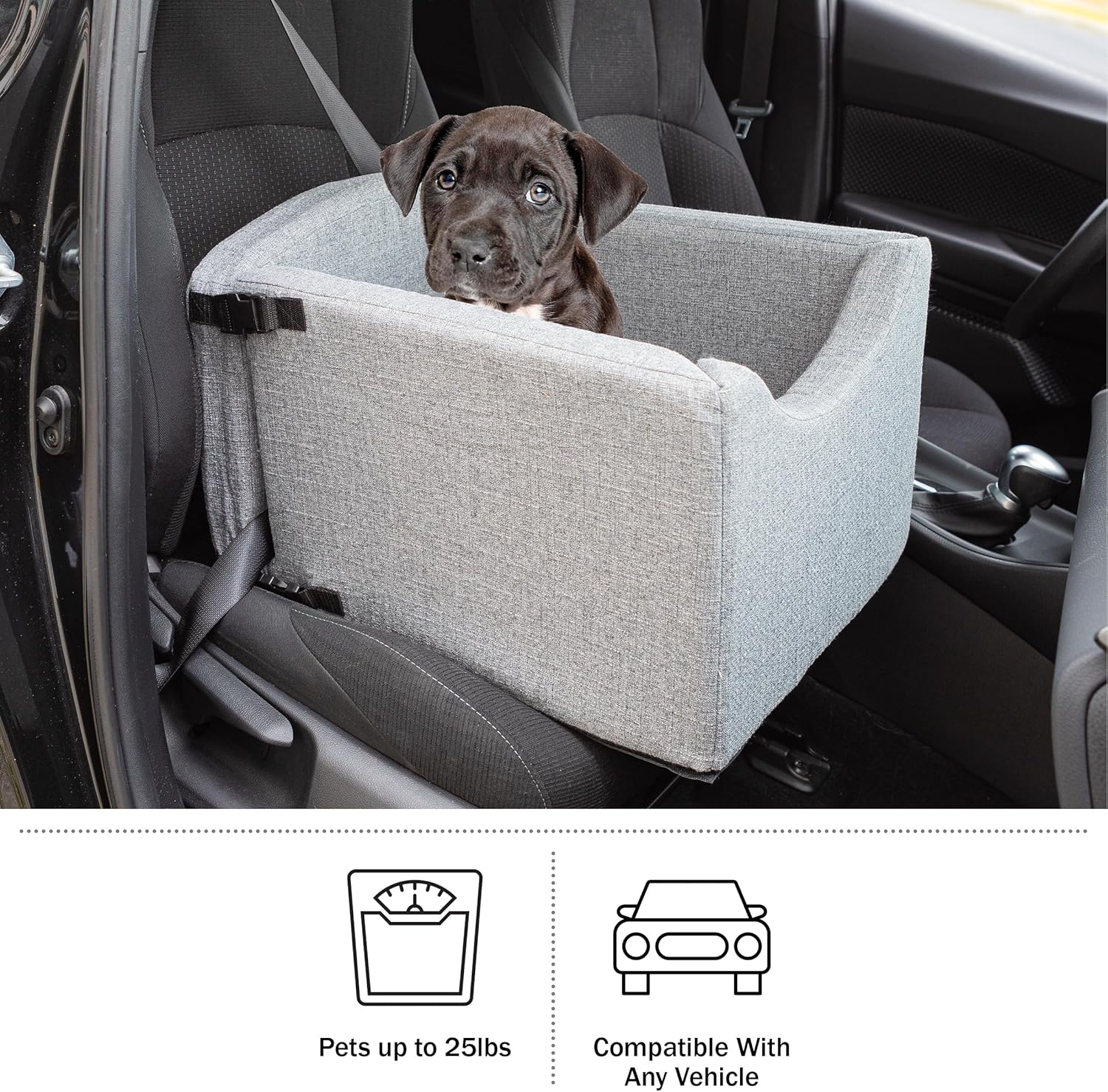 - DOG CARSEAT - This car seat for dogs and cats comfortably fits small pets up to 25lbs and is compatible with any vehicle with seat belts. The dog car bed can be used in the front or backseat and helps protect your interior from damage and pet hair.