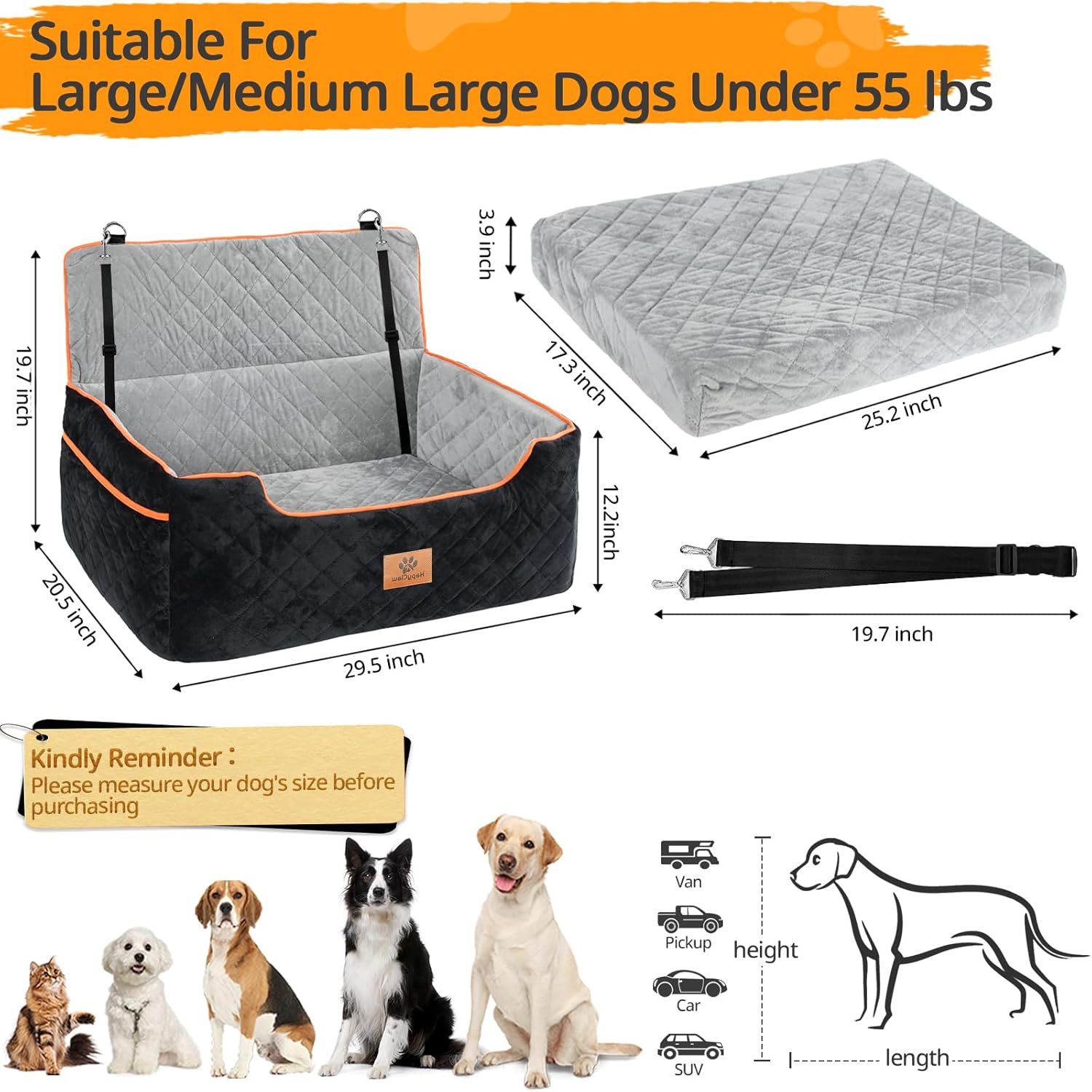 - Large Size Dog Car seat: The dog booster seat measures 29.5"(L) x 20.5"(W) x 19.7"(H). Its universal size easily accommodates large and medium-sized dogs under 55 lbs or 2 small pets under 20 lbs. suitable for all breeds
