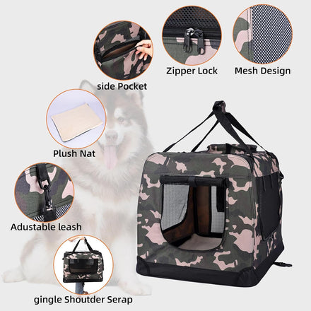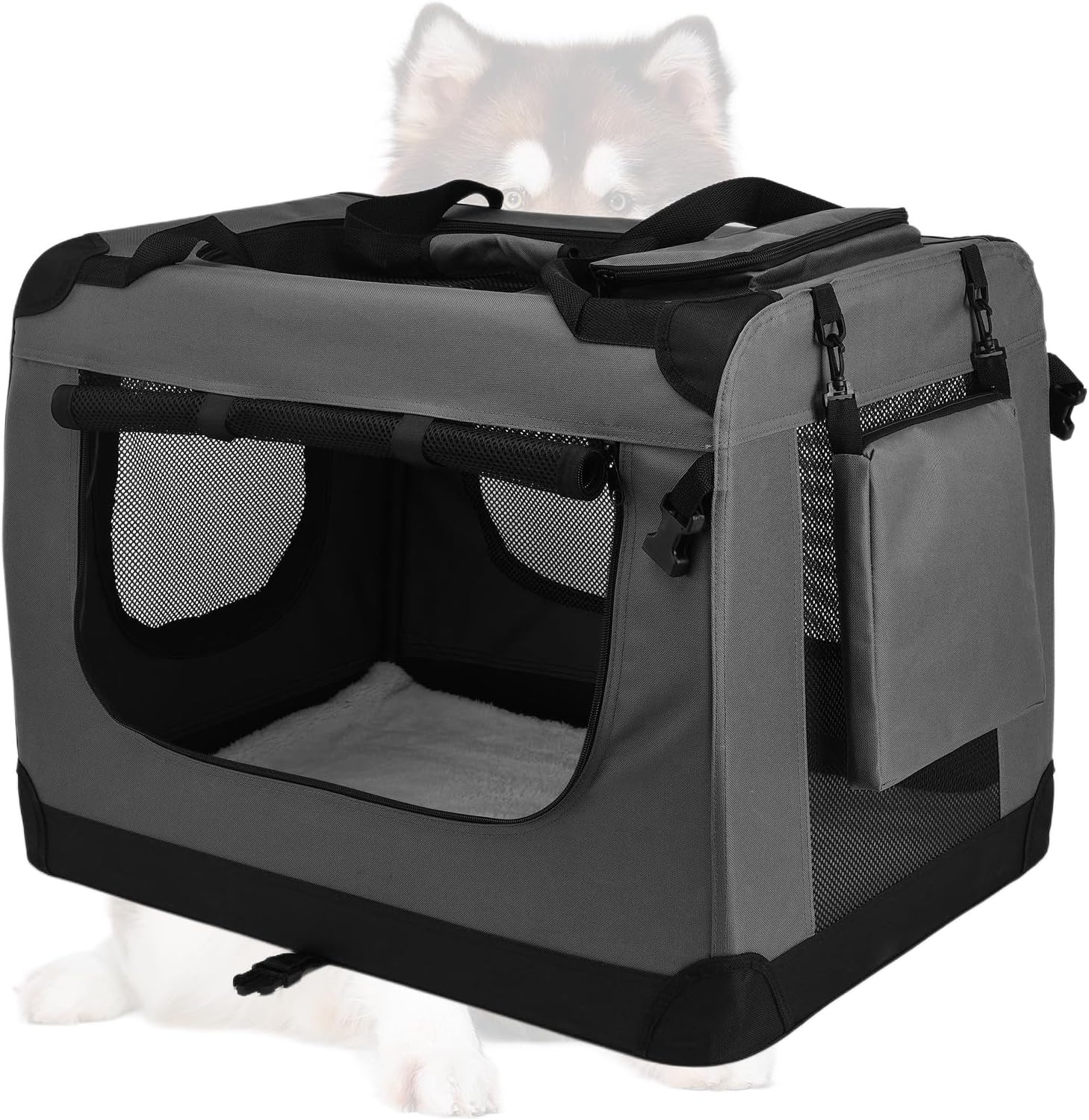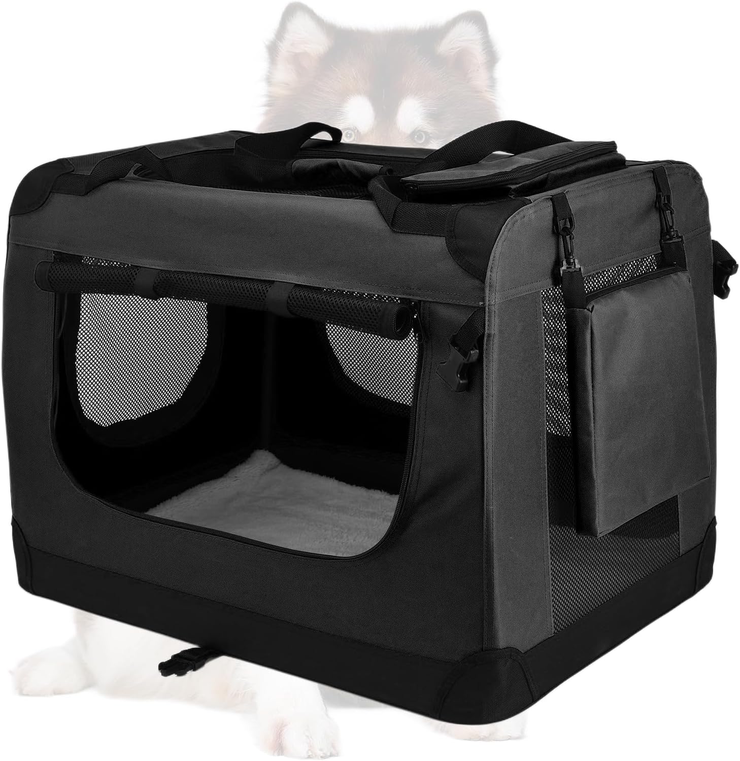 - MULTI FUNCTIONAL DESIGN: This dog crate for car is equipped with an adjustable fixed belt, stable and non-slip when traveling; dog carrier bag side zipper pocket design, convenient for storing pet snacks.