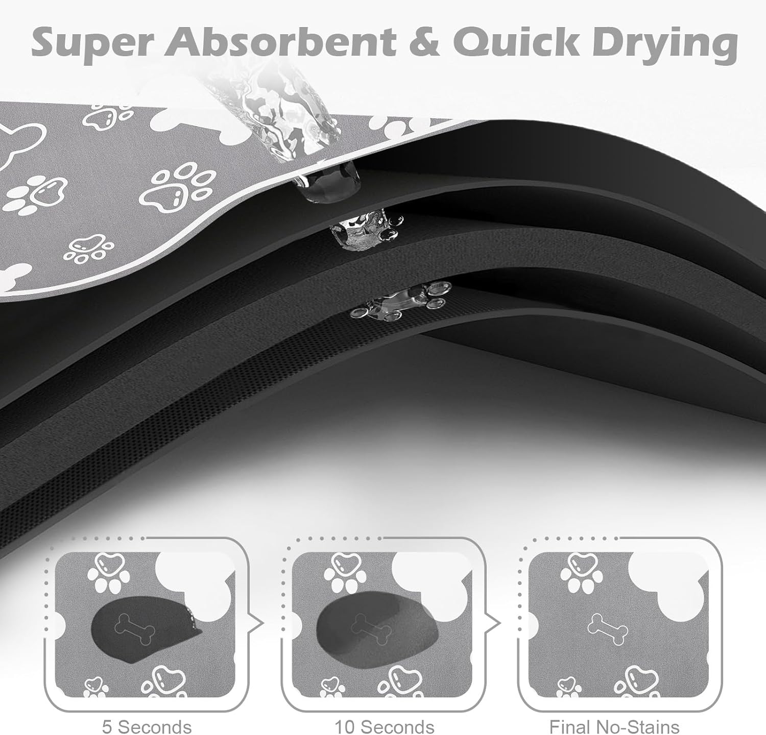- Super Absorbent & No Stains: This pet feeding mat is extremely absorbent and dries quickly, absorbing any spilled water and milk,protecting your floors from stains and damage. Say goodbye to messy feeding areas and hello to a tidy, organized space that both you and your pets will appreciate.