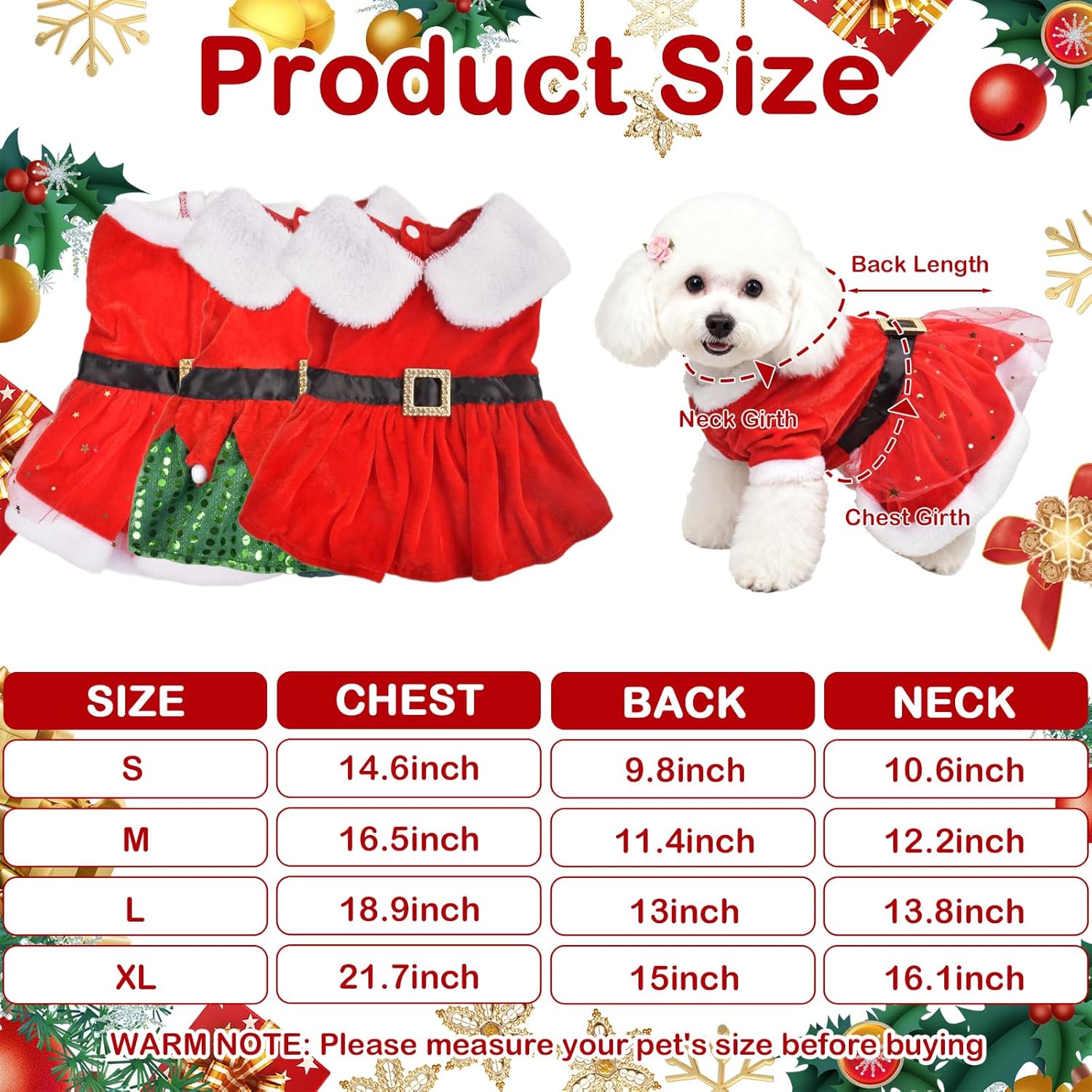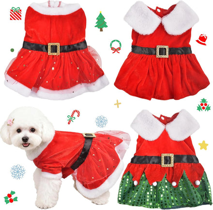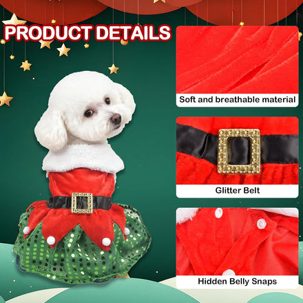 - Dog Christmas Dress Set: This 6-piece collection includes a festive outfit featuring a red Santa top with emerald green sequin skirt, a classic red sparkle dress adorned with a shimmering belt and soft snow-white plush faux-fur collar for timeless warmth, and a red velvet gown paired with a glitter belt, snow-white plush trim, and iridescent sequin tulle skirt layer. Together, they'll transform your pup into a showstopper who steals the spotlight at holiday gatherings.