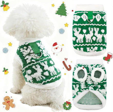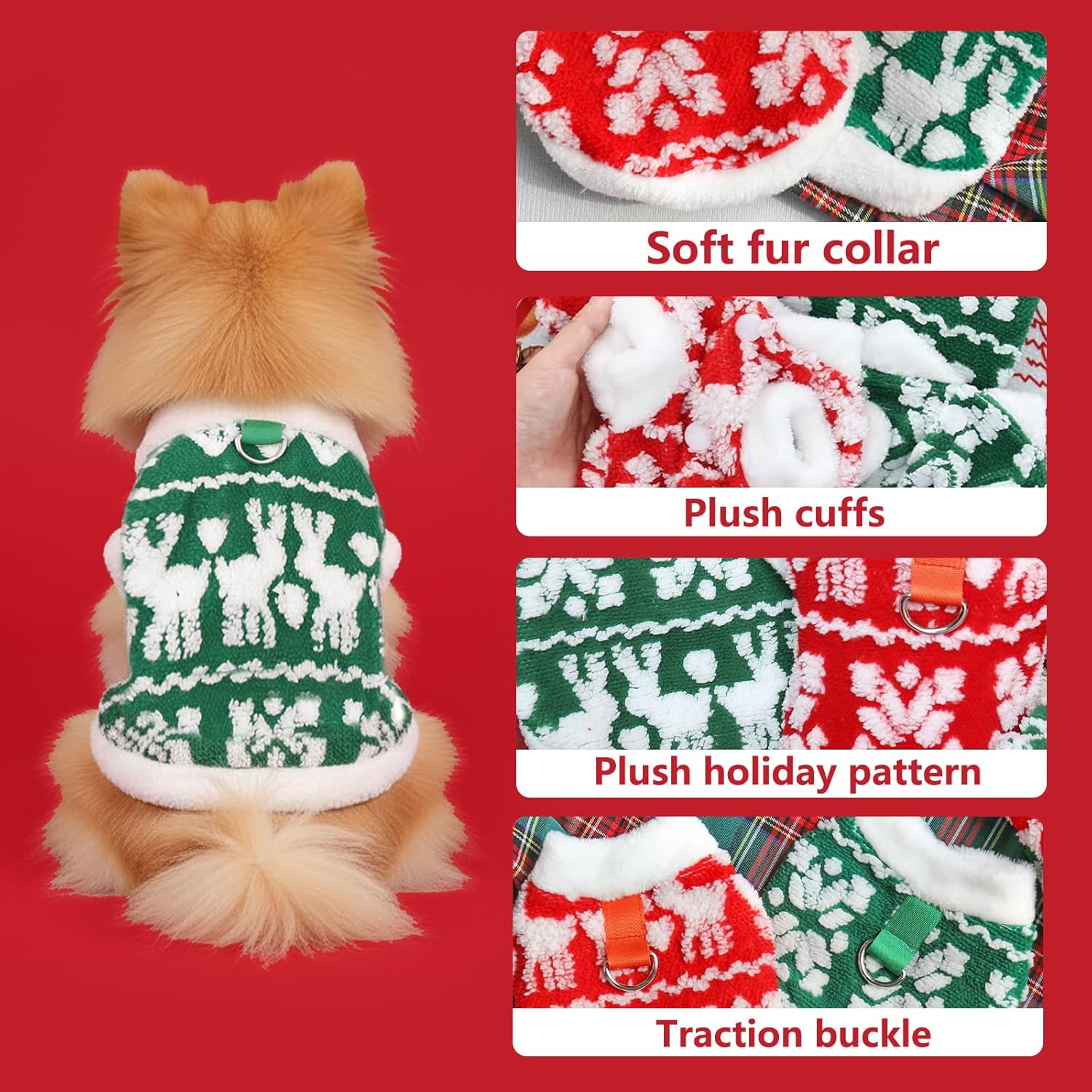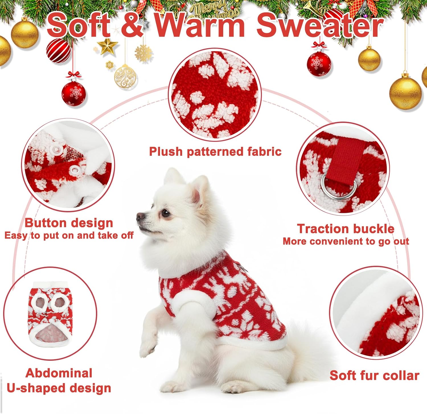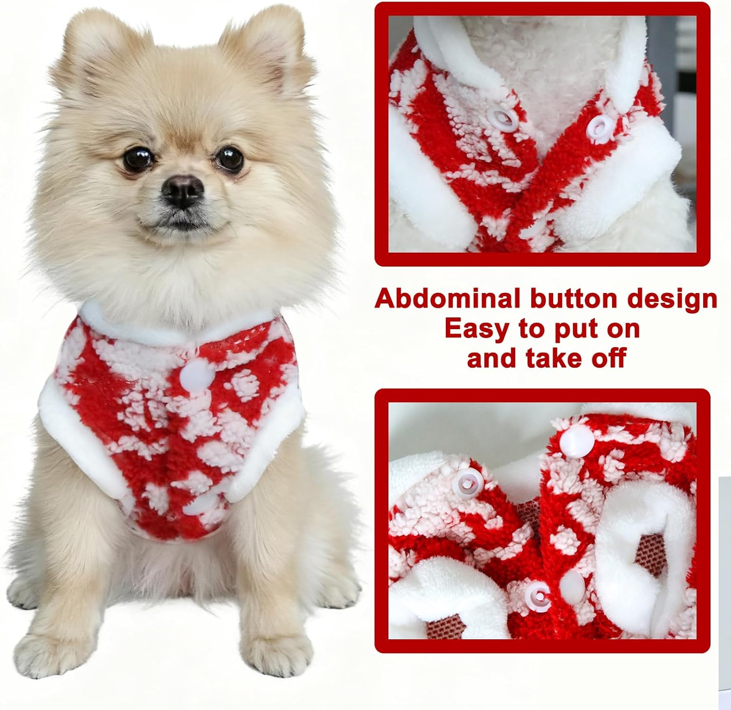 • Easy to put on and take off: This puppy Christmas fleece features a button closure design, making it convenient to put on and take off. It has a traction buckle on the back, which can be directly used to leash the dog.