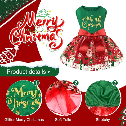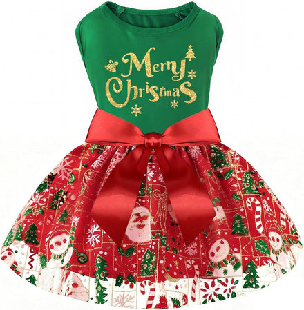 - Adorable Christmas Dog Dress: Dog Christmas outfit dress with sparkly text “Merry Christmas” is decorated with Christmas tree, Santa Claus, snowman, snowflakes, etc. With a red bow sewn on, this adorable Christmas dress helps pets stand out during holiday gatherings, photos, or walks