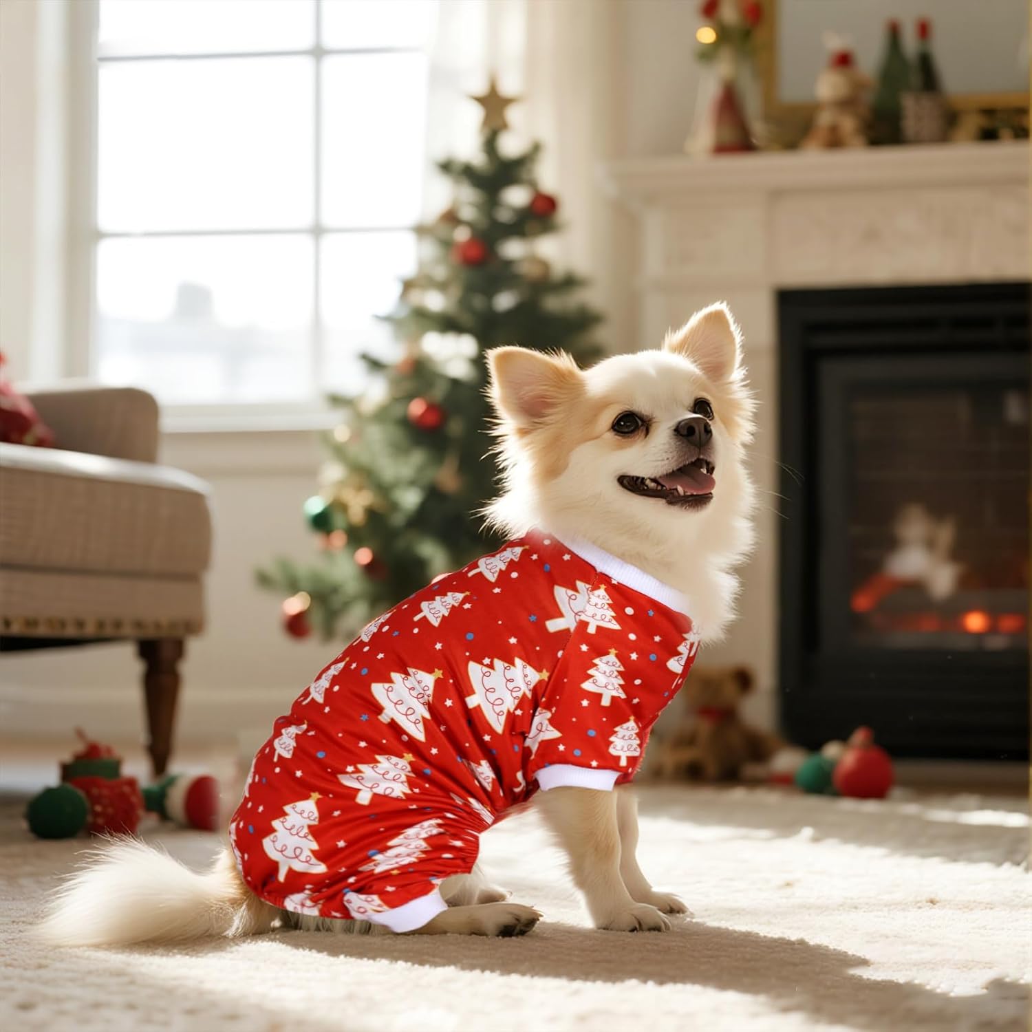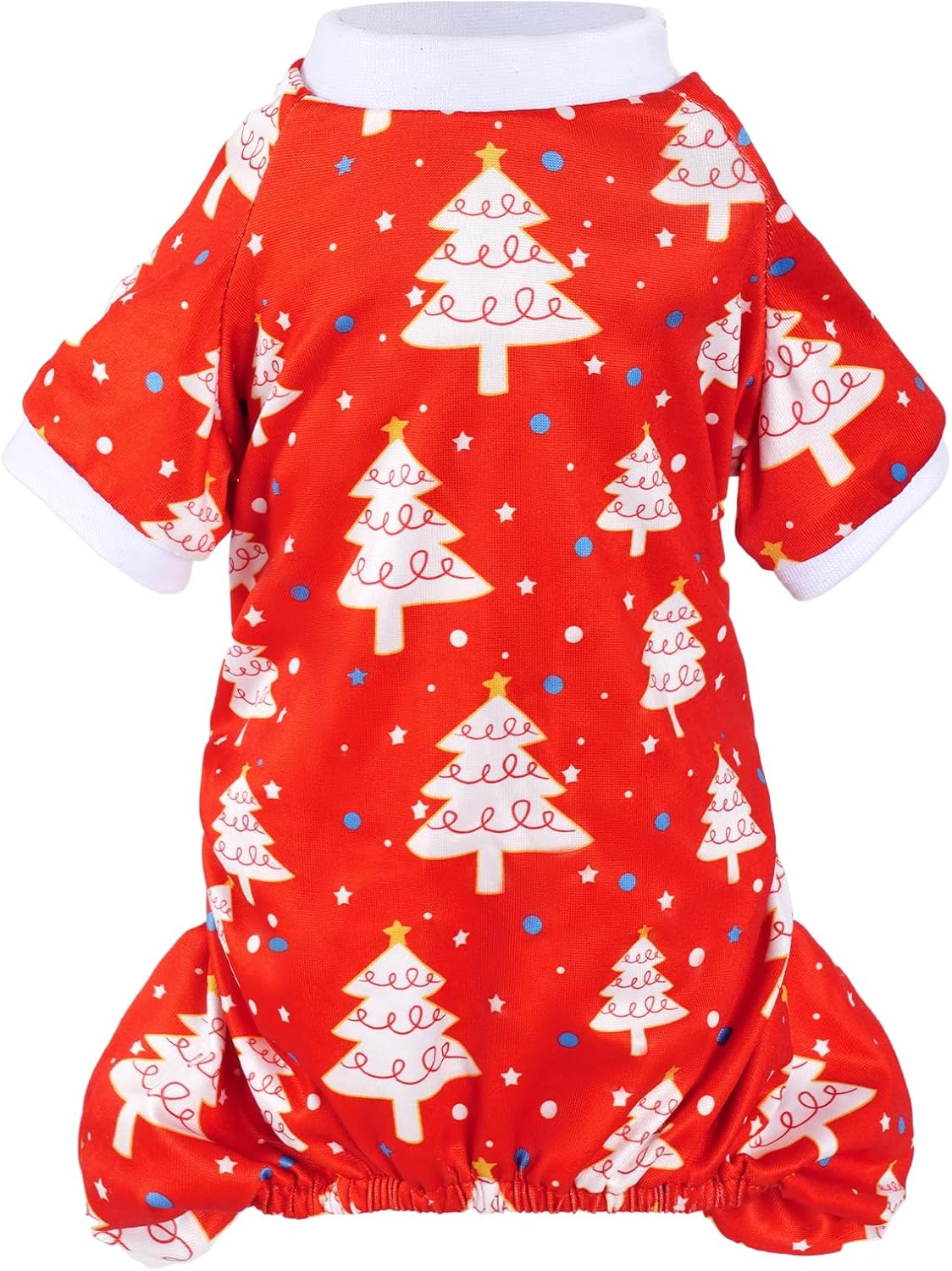 • Unique Design: Our puppy Christmas pajamas feature a red base adorned with a white Christmas tree (topped with a golden star) and blue polka dots, creating an exceptionally charming and adorable look.